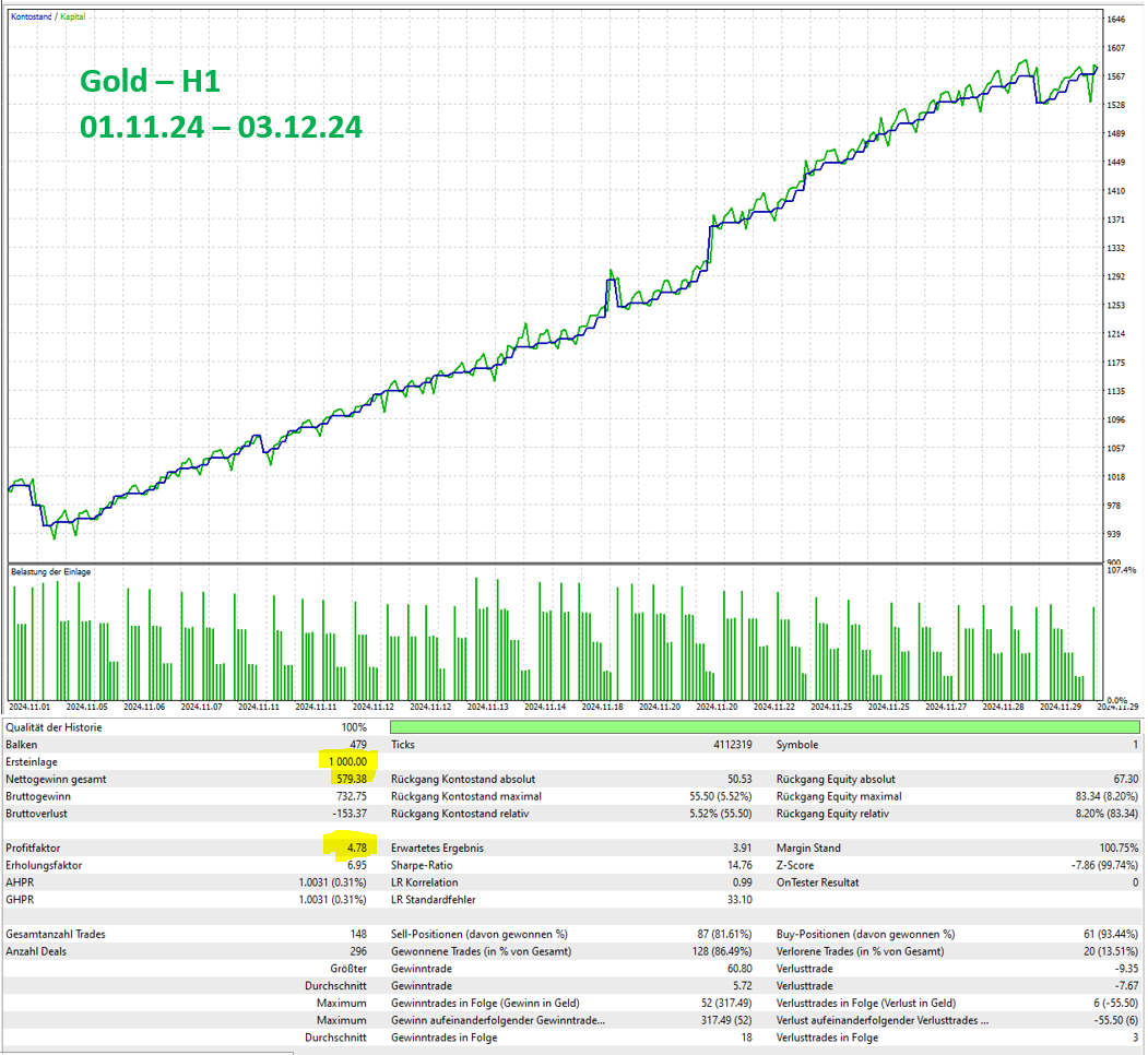 New backtest for Gold in timeframe H1. Tested November 2024. Great results.