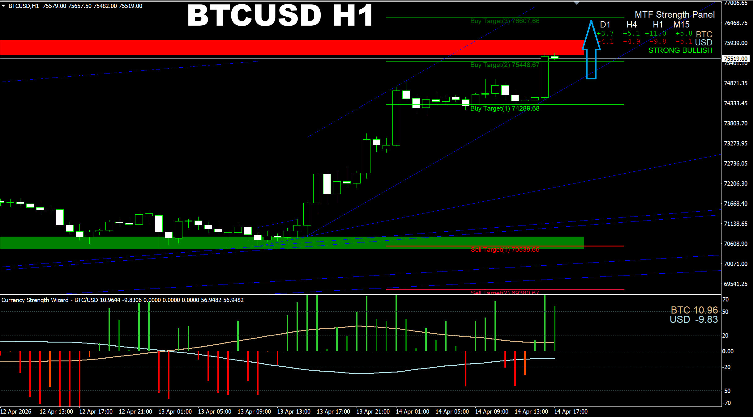 Currency Strength Wizard. BTCUSD H1. Update on current market. Further UP move is expected which may lead the price up to 75K+.