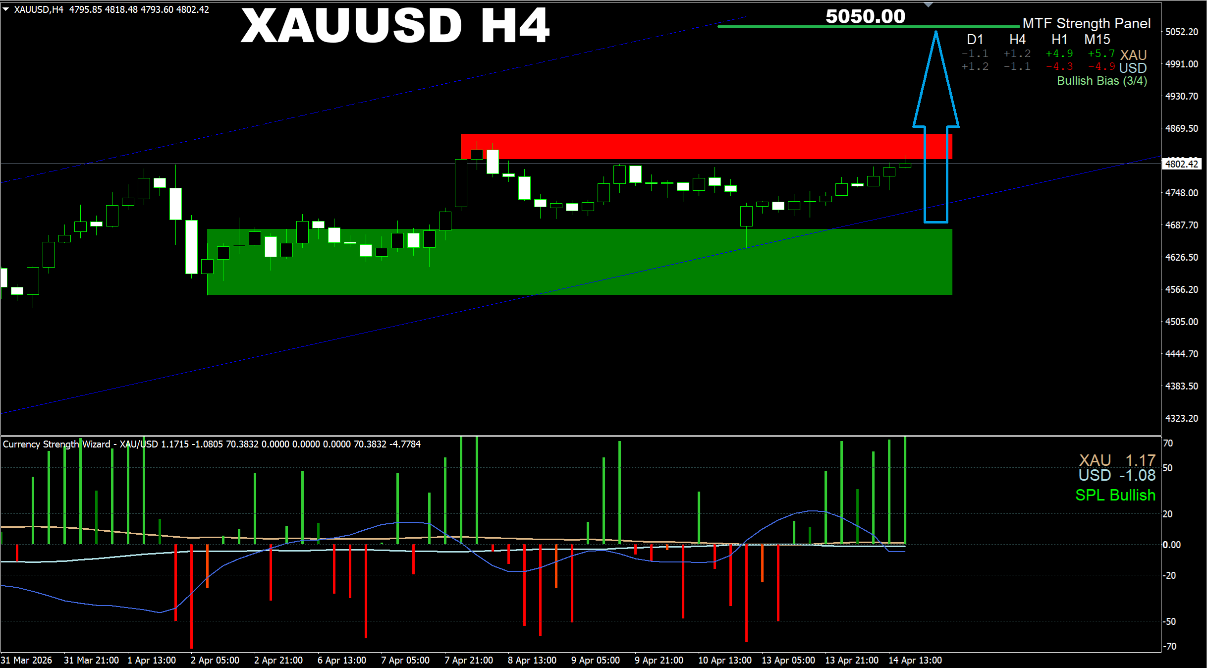 Currency Strength Wizard. XAUUSD H4. Update on current market. Price is being traded in a corridor with a tendency to break it up. In case of a breakout which is highly possible, the price will have a corridor ready to lead the price up to the 5050.00 area eventually. Based on the analysis of time frames from H1 up to D1, I see that this scenario is absolutely possible, and I can say even more, it is expected. Just an idea for you what we can possibly prepare for in terms of the near future.