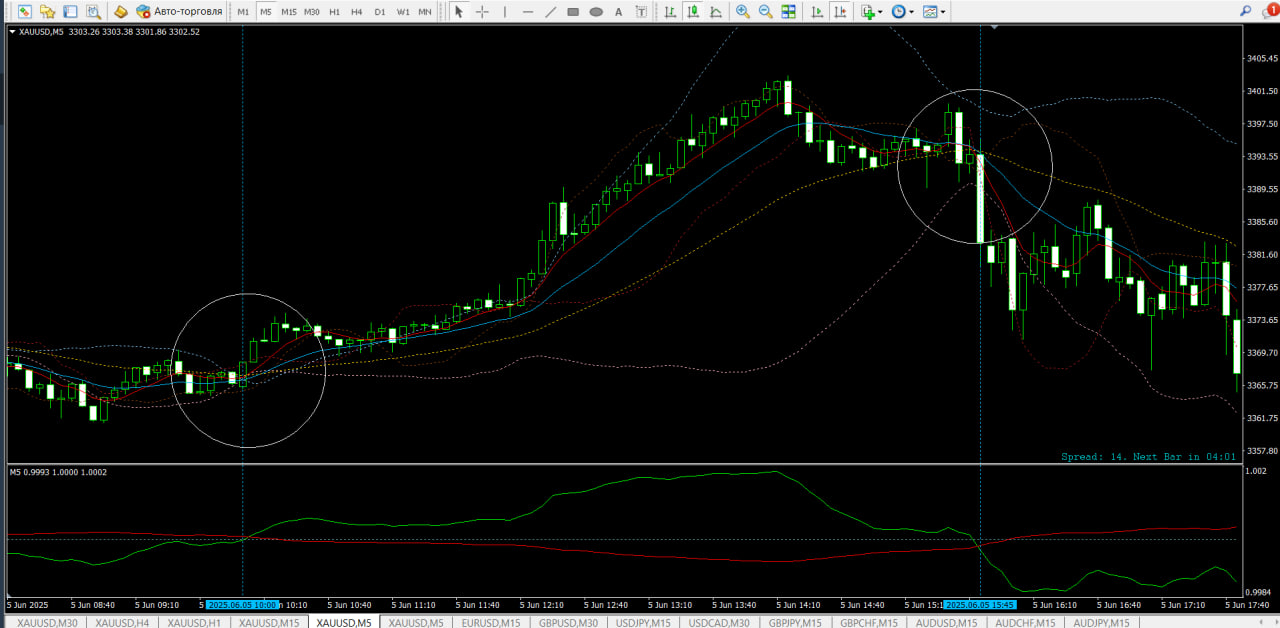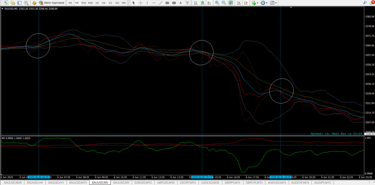 "Scalper_PRO" göstergesi, grafikte yeniden çizim veya gecikme olmaksızın iki çizgi ve sinyal şeklinde bir temel göstergedir. "Scalper_PRO" göstergesi grafikte trend boyunca en iyi giriş noktalarını gösterir. Gösterge M1 zaman diliminde iyi sonuçlar gösteriyor. Sinyal, mum kapandıktan sonra üretilir ve ön sinyaller nokta şeklinde mavi ve kırmızı oklar şeklinde görünür. "Scalper_PRO" göstergesi ölçeklendirme için tasarlanmıştır. Ekran görüntülerinde konum giriş noktalarının örnekleri