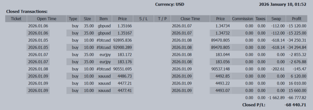 Capital Abandoned Currencies and Fled to Gold — A Week When the Market Clearly Showed Its “Safe Haven” 📊 Trading Results (Jan 5 – Jan 9) Weekly P/L: -68,440 USD This was not a week to “read curren...