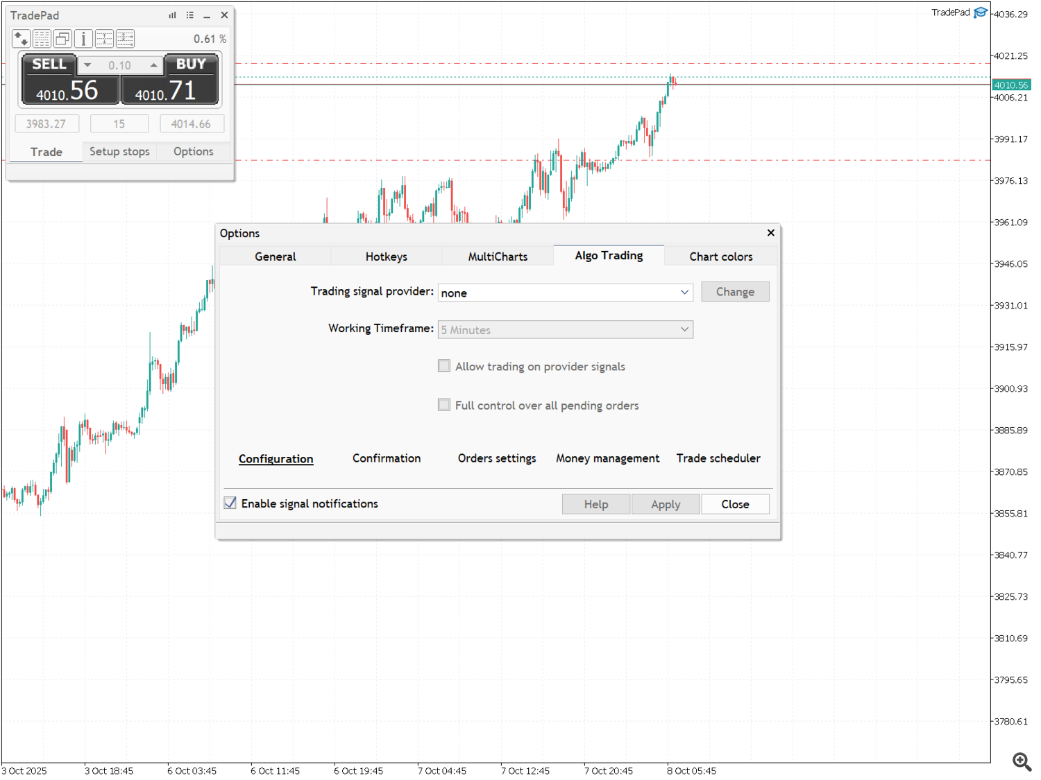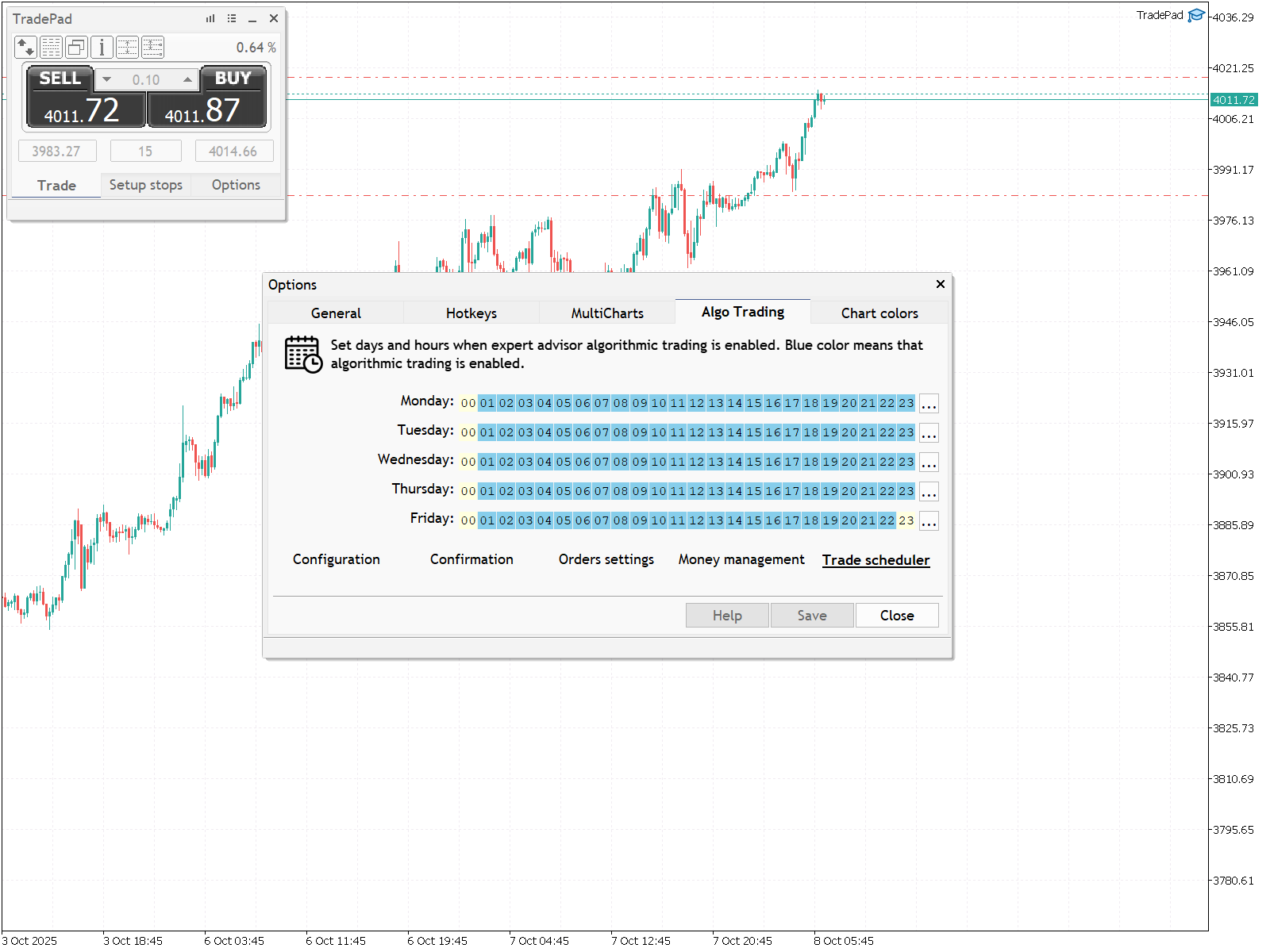 在此选项卡中,您可以配置算法交易的参数。此选项卡包含其他选项卡:"Configuration", "Confirmation", "Orders settings", "Money management"和"Trade scheduler"。