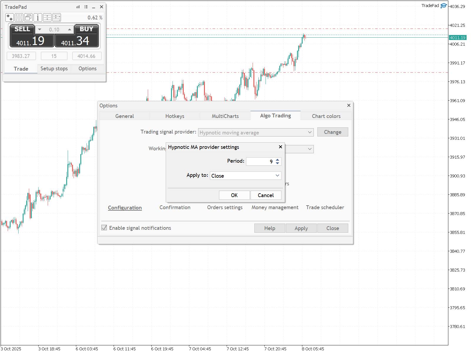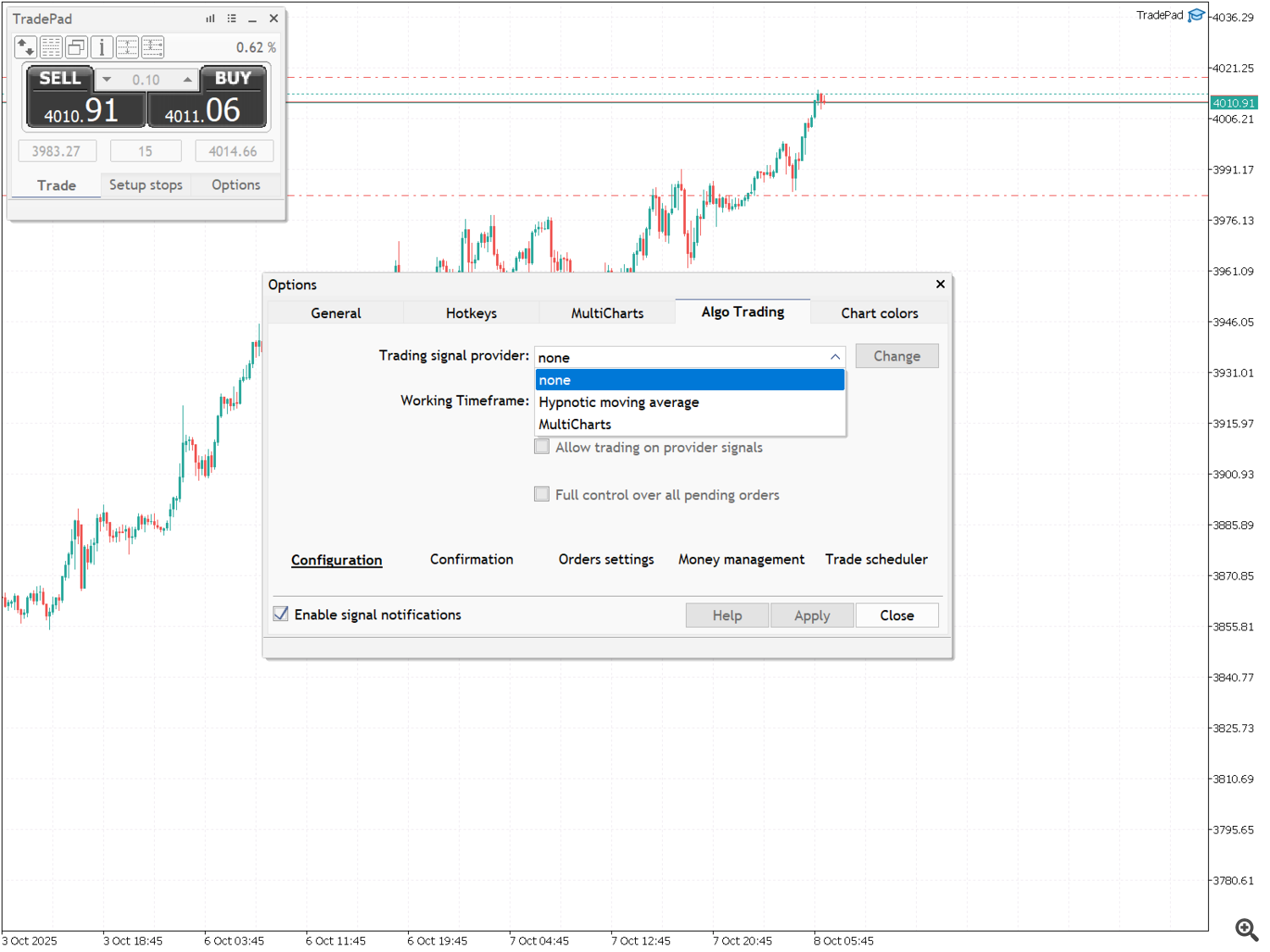 对于算法交易,TradePad 补充了交易信号提供商系统。目前,我们提供了一个基于趋势指标“催眠移动平均线”的交易信号提供商,该指标也包含在 MultiCharts 工具的指标集合中。未来,交易信号提供商库可能会扩展,这将为您构建交易系统提供更多选择。所有提供商都将在此处发布,并以单独的智能交易系统 (EA) 的形式提供其使用说明,供您在策略测试器中进行测试。这让您有机会在实际交易之前根据历史记录测试提供商。有关连接交易信号提供商的更多详细信息,请参阅下文的TradePad 设置部分。