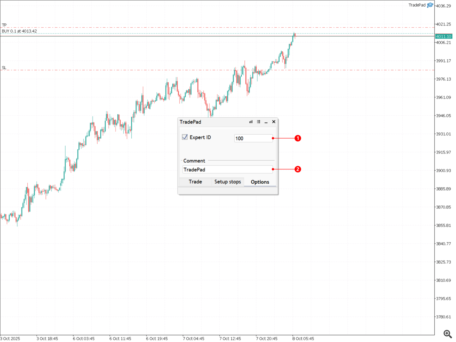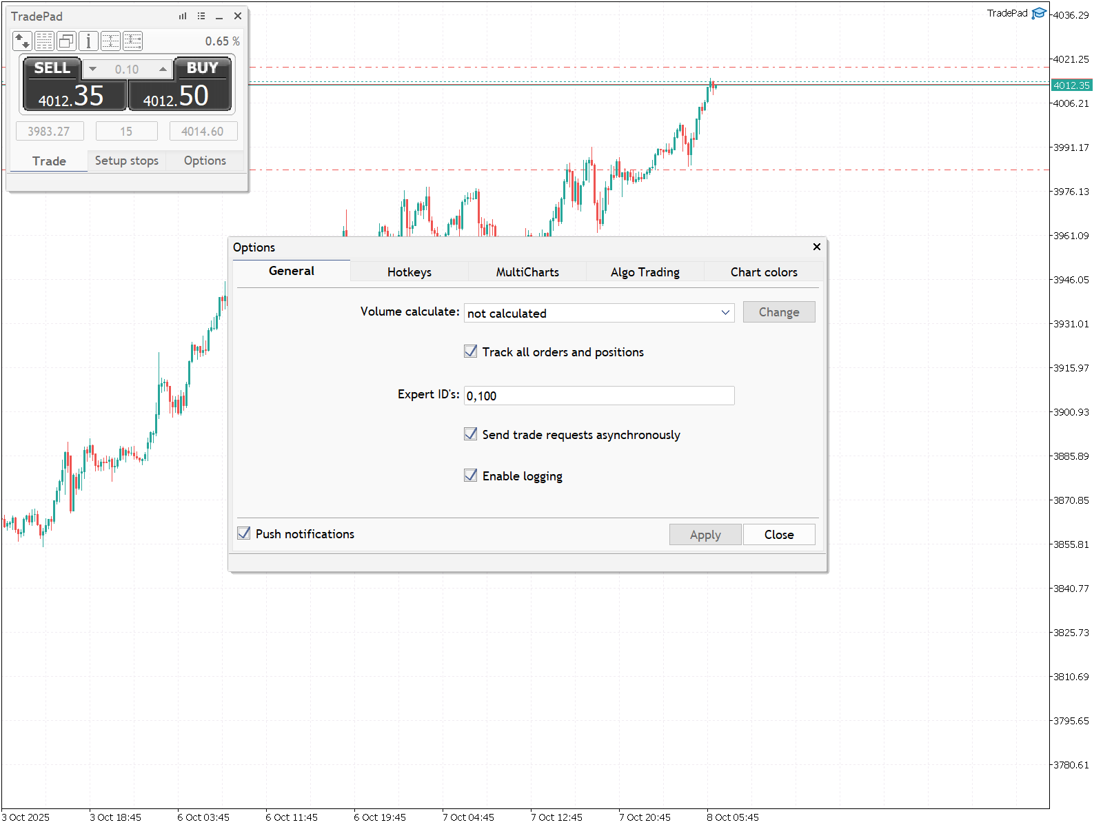 下一项“Track all orders and positions”用于启用/禁用跟踪具有不同 ID 的仓位和订单。如果禁用此选项,TradePad 将仅跟踪具有先前指定 ID(主窗口 -> "Options"选项卡 -> Expert ID)的“其”仓位和订单。要跟踪具有不同 ID 的仓位和订单,请启用“Track all orders and positions”开关,并在“Expert ID's”字段中输入所有 ID,并用逗号分隔。要执行异步交易操作而不等待交易服务器对发送请求的响应,请启用“Send trade requests asynchronously”开关。TradePad 运行期间会生成各种消息。要将这些消息显示在“专家”日志中,请启用“Enable logging”开关。您还可以在使用交易水平标记工具时设置自动计算手数的风险百分比。