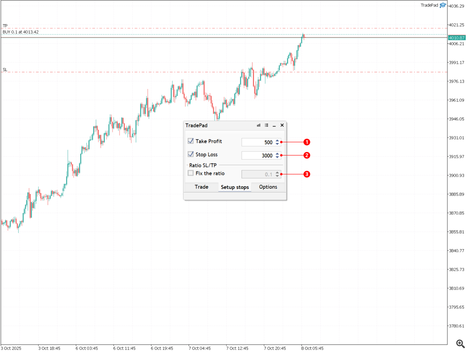此选项卡允许您设置止盈和止损点位(以点为单位)。您还可以指定止损与止盈的比率。您可以使用输入栏右侧的箭头或键盘更改这些值。