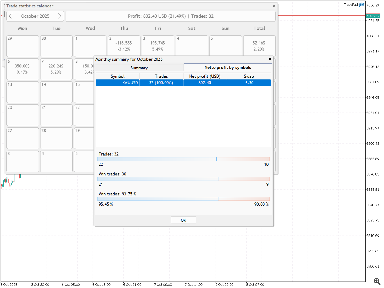 - 貿易統計日曆 用於查看一天、一週、一個月的交易結果;