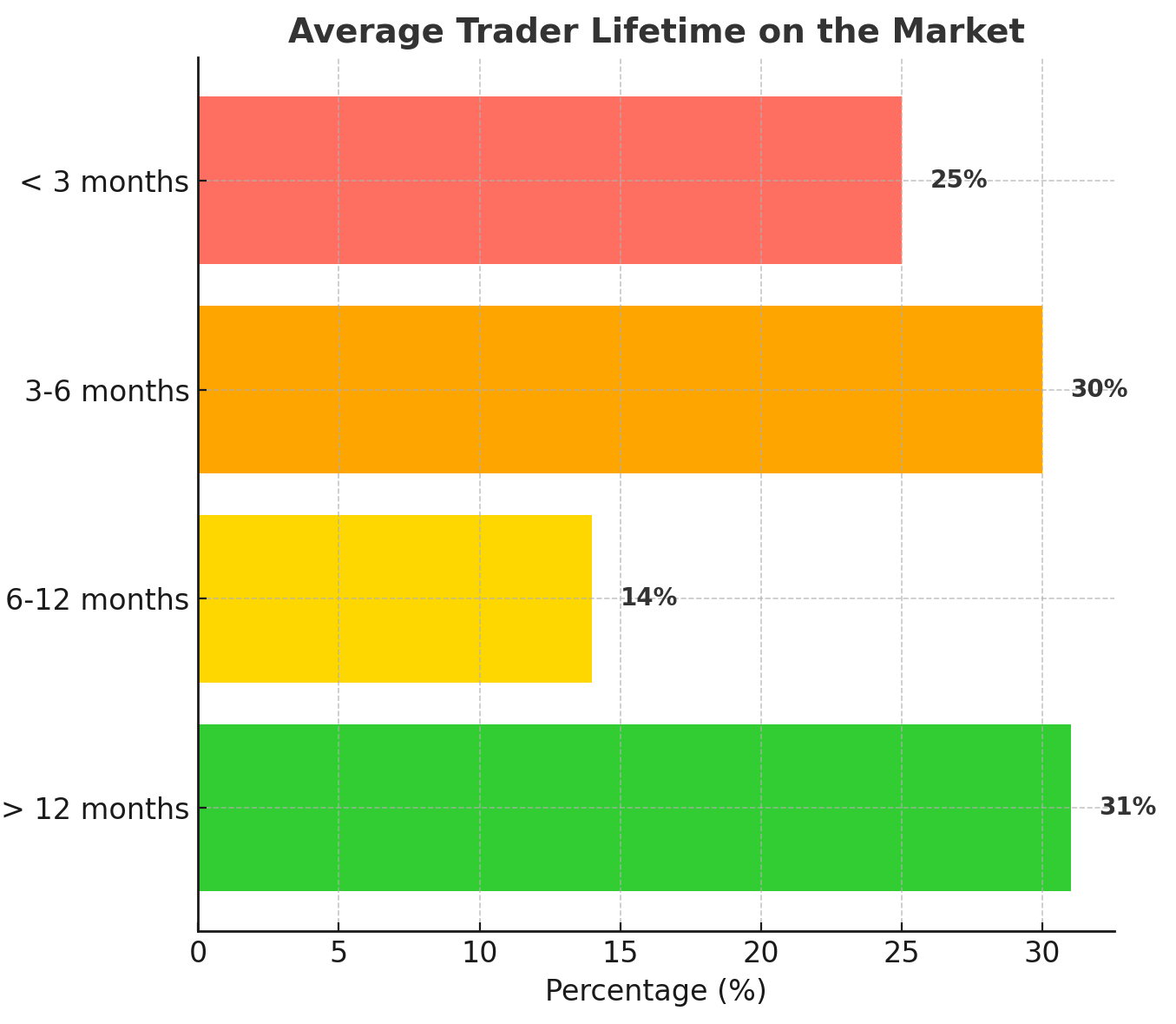 来自美国和英国的研究显示,最多 80% 的零售交易者 会在第一年退出市场。经纪商也表示,一个交易账户的平均生命周期只有 6–10 个月。主要原因是知识不足和初期压力太大。
