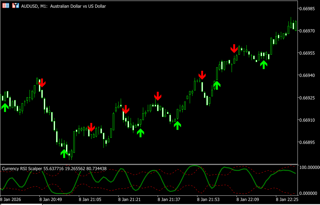 伙计们,别再听那些炒作啦!今天我仅用一个工具——Currency RSI Scalper(货币RSI剥头皮指标),就在AUDUSD的M1图表上轻松赚了+63美元。没有AI,没有玄学,只有真正能在真实市场环境中有效运作的自适应RSI逻辑。