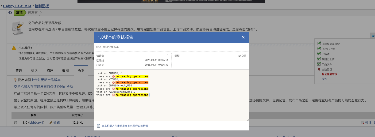 这种情况大概率是你的代码不符合规范。虽然在本地MT4上可用,但要上传须符合它的规范化要求, 否则视为不合格。比如,开仓手数规范化,开价规范化,止盈、止损位规范化,等等……我曾给他们修改过几个,这里面有很细致的检查才行。