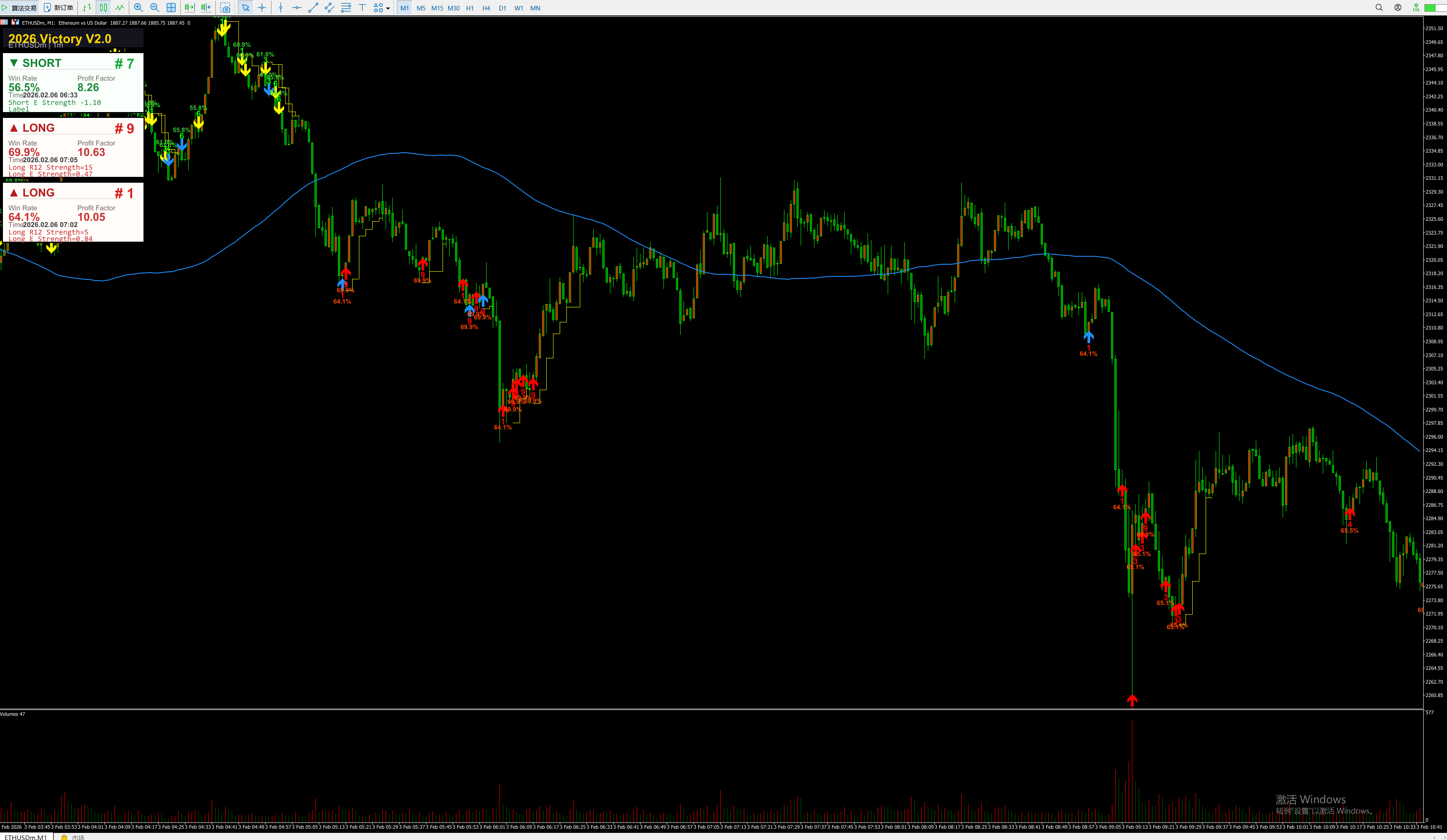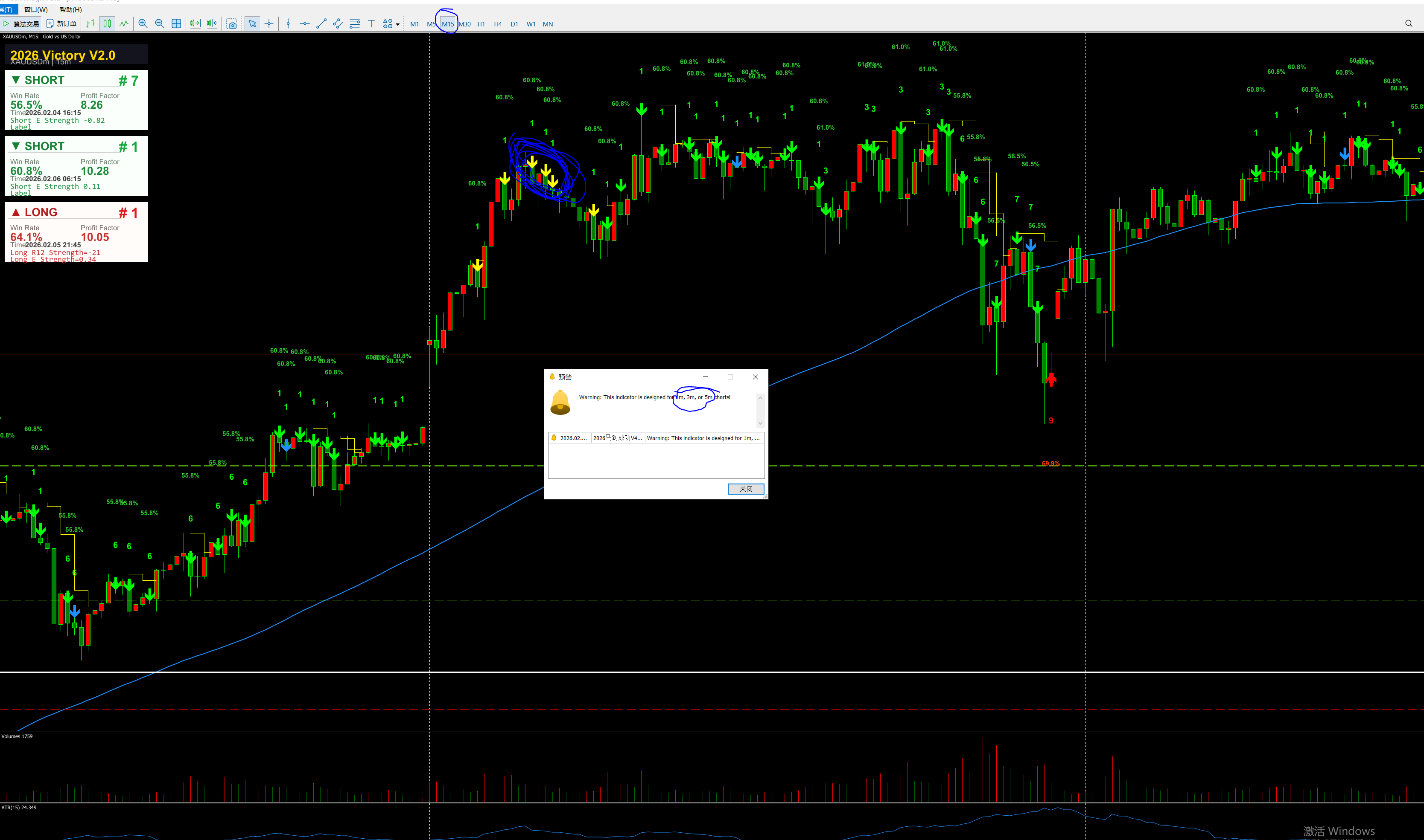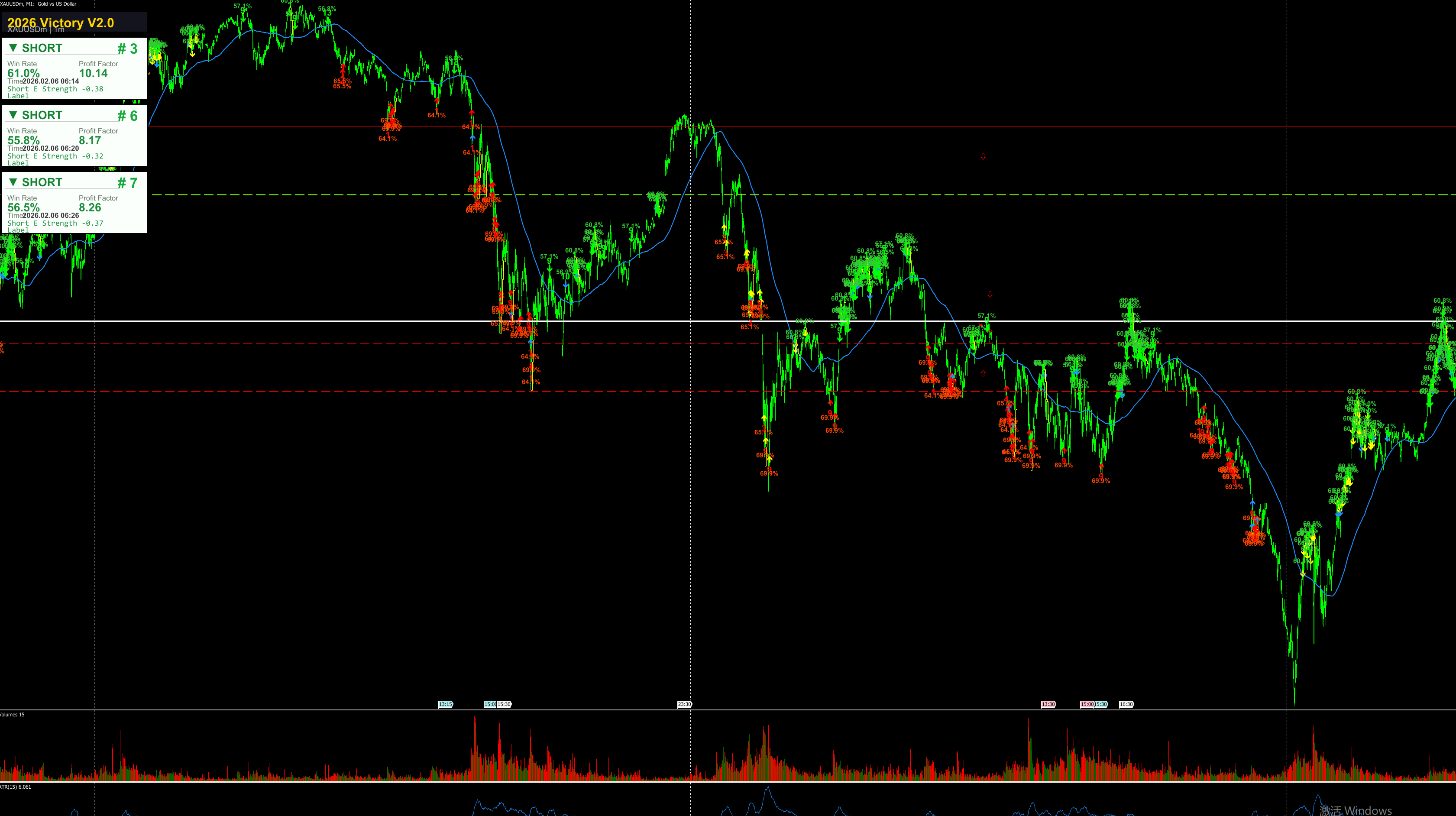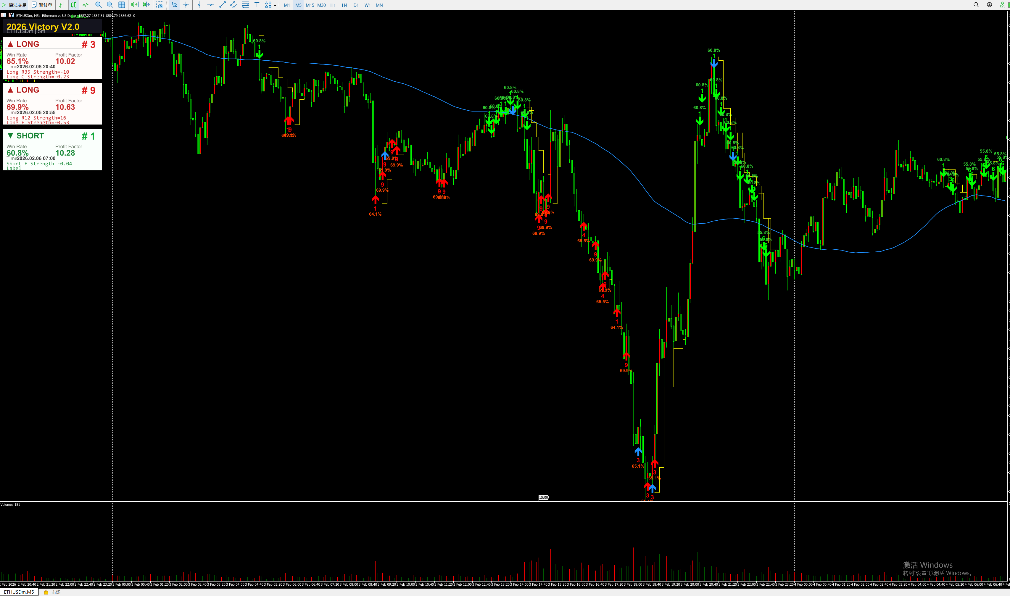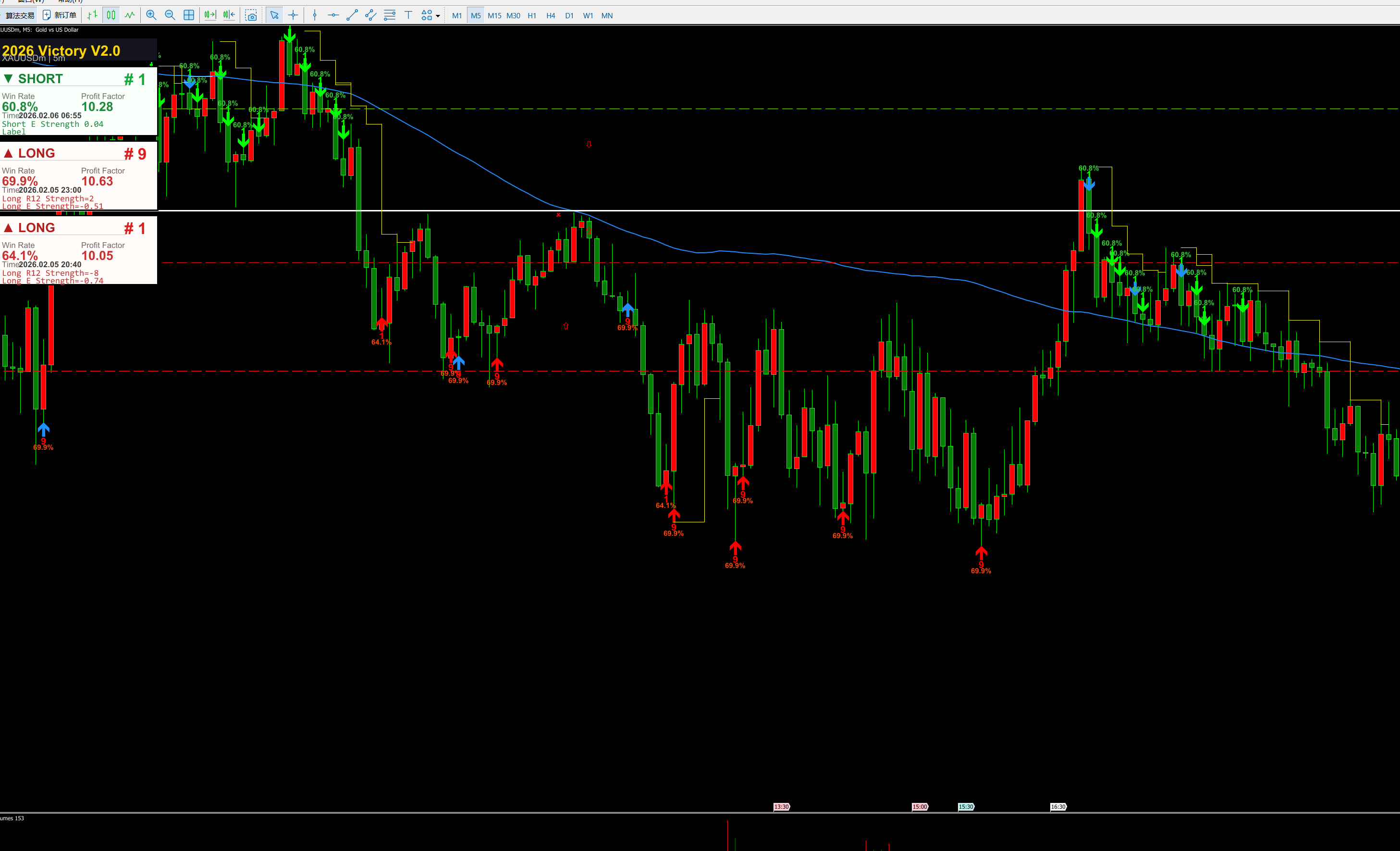 当前指标有三种信号。红绿信号单次成功率在6成以上可以获取高收益,蓝色信号为精准信号90%以上可以获得高收益,黄色信号99%的概率可以锁定收益。上点截图,目前这个ea脚本所有运算是ai跑了好久跑出来的,加载后内存占用在400M以内,不同信号频率有所不同,但是每次ai出新的结果可以无限加理论是可以加很多信号的频率的,红绿蓝黄是我一直实盘不断调整修正的准确率极高,我就截图缩放一下这样好看清楚。