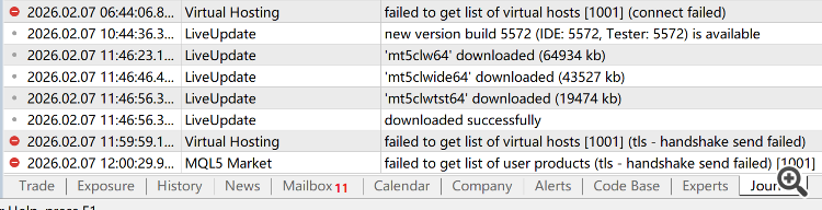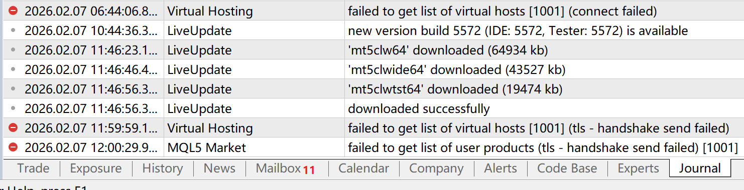 为什么5430的版本,版本更新一直可以,而市场却不能连接,这到底是为什么呢? 新评论 king1898 2026.02.07 04:04 如图所示,软件是可以更新的,而且是自动下载的,删除了很多次,依然会自动下载更新,但是市场却是一直都报失败,MQL不准备解决这个问题吗? 我是个屑欧尼酱 2026.02.07 08:30 #1 更新到最新版本可以了 king1898 2026.02.08 03:22 #2 你在香港,用外网应该是可以的,目前你用的最新版是哪个版本呢?谢谢 我是个屑欧尼酱 2026.02.08 03:57 #3 king1898 #: 你在香港,用外网应该是可以的,目前你用的最新版是哪个版本呢?谢谢 5577版本,从官网下最新的 Xinhai Yang 2026.02.08 06:38 #4 king1898: 如图所示,软件是可以更新的,而且是自动下载的,删除了很多次,依然会自动下载更新,但是市场却是一直都报失败,MQL不准备解决这个问题吗? 手机使用VPN外网,只要找到服务器连接上,就不需要外网了!国内网链接不上!理论上讲,你应该也连不上这个网站啊!怎么发的帖! 新评论 您错过了交易机会: 免费交易应用程序 8,000+信号可供复制 探索金融市场的经济新闻 注册 登录 拉丁字符(不带空格) 密码将被发送至该邮箱 发生错误 使用 Google 登录 您同意网站政策和使用条款 如果您没有帐号,请注册 可以使用cookies登录MQL5.com网站。 请在您的浏览器中启用必要的设置,否则您将无法登录。 忘记您的登录名/密码? 使用 Google 登录