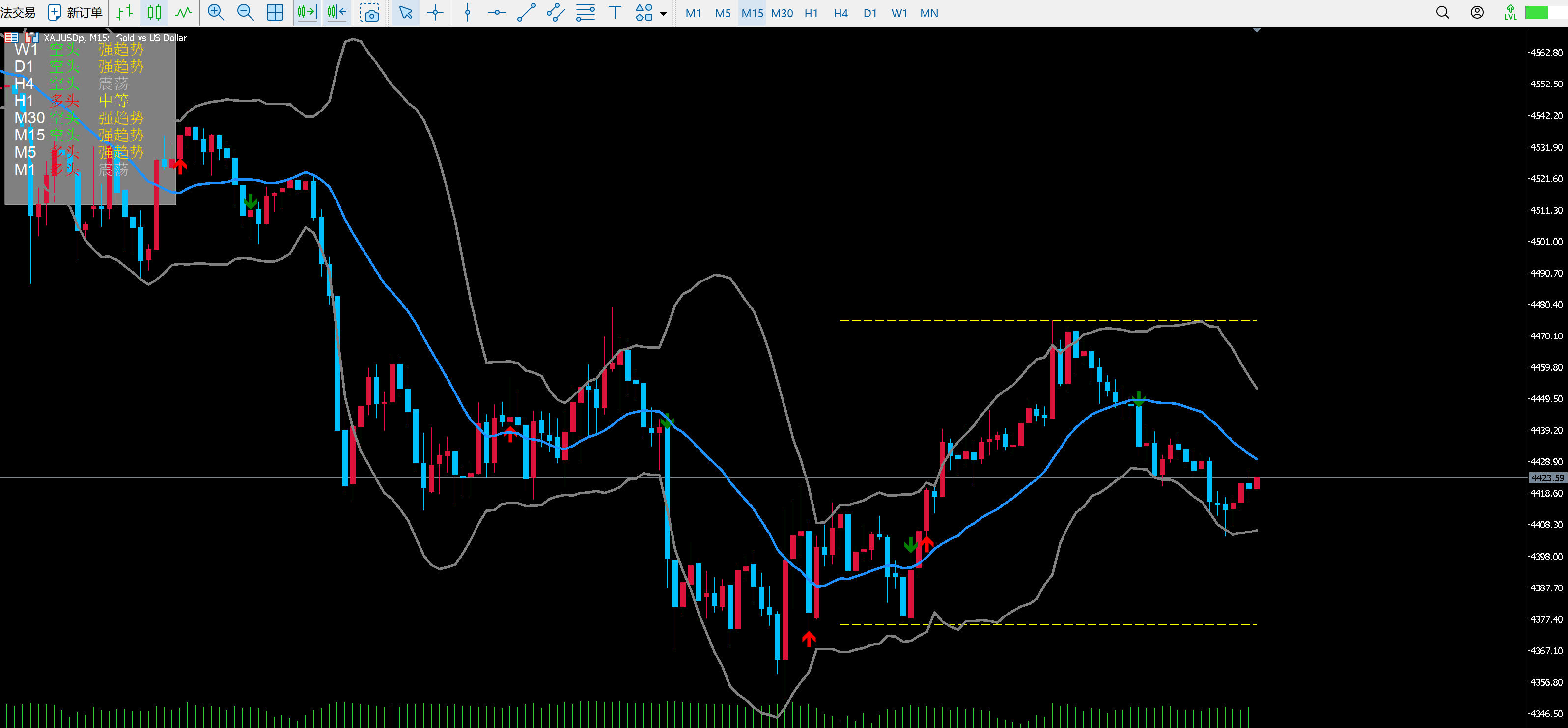 一个可以自主判断行情多空,趋势强弱,明确的进出场信号,带支撑阻力显示的指标,分享给大家 新评论 En Wang 2026.03.27 12:06 📈 趋势交易追踪器Pro--我的V:NOMO409567 多维度智能趋势分析指标 · 让交易决策更清晰 📊 多周期共振⚡ 自动信号弹窗🎯 支撑阻力识别🔔 到期智能提醒 🎯 产品概述 趋势交易追踪器Pro 是一款专为外汇、黄金、原油、加密货币等金融产品设计的多维度智能分析指标。它将复杂的多周期分析、技术指标信号、支撑阻力识别等功能整合在一起,为您提供一站式的交易决策支持。 自动识别买卖信号 金叉/死叉自动标记,弹窗提醒,不错过任何机会 全面分析多周期趋势 8个时间框架(周线~1分钟)趋势状态一目了然 精准定位支撑阻力 自动绘制亚欧/美盘时段高低点水平线 智能提醒系统 信号弹窗 + 到期前提醒,轻松管理 ⚡ 五大核心功能 1️⃣ 智能买卖信号(金叉/死叉) 基于5周期和20周期移动平均线交叉原理: 🔴 红色向上箭头 → 看涨信号 🟢 绿色向下箭头 → 看跌信号 ✅ 每根K线只弹窗一次,避免重复打扰 2️⃣ 多周期趋势面板 图表左上角同时显示8个周期的趋势方向 + 趋势强度: 🔴 红色 = 多头(上涨) | 🟢 绿色 = 空头(下跌)🟡 金色 = 强趋势 | 🟡 黄色 = 中等 | ⚪ 银色 = 震荡 3️⃣ 布林带波动区间 蓝色实线 中轨(20周期均线) | 灰色虚线 上轨/下轨(标准差通道)使用技巧:价格触及上下轨 → 超买/超卖信号;通道收窄 → 变盘预警;通道扩大 → 趋势延续。 4️⃣ 时段支撑阻力线 指标自动分析 亚欧时段 和 美盘时段 的支撑阻力线。显示逻辑:当前时段显示上一时段的高低点(黄色水平线),为您提供关键支撑阻力参考区域。 5️⃣ 智能提醒系统 🔔 信号弹窗:出现向上/向下箭头时自动弹出提醒,并显示具体周期和时间。📅 到期提醒:指标到期前7天弹出提示,过期后自动禁止加载并显示自定义联系信息。 📌 实战交易策略(面向普通投资者) 🎯 策略一:多周期共振(最稳定) 趋势面板至少3个周期同时显示红色(多头)或绿色(空头) 当前图表出现对应的买入/卖出箭头信号 价格回踩布林下轨(做多)或上轨(做空),或接近黄色支撑/阻力线 → 考虑顺势入场 🔄 策略二:顺势回调(最实用) 长周期明确趋势(如H4红色多头) 短周期出现反向信号(M15/M5绿色死叉)回调 等待短周期重新出现顺势信号(红色金叉) → 顺长周期方向入场,止损设在前低/前高 ⏸️ 策略三:震荡行情识别与观望 趋势面板多个周期显示“震荡”(银色) 布林带通道明显收窄 避免追涨杀跌,可在黄色支撑/阻力线附近高抛低吸,快进快出 📈 策略四:支撑阻力线突破跟随(最主流) 亚欧盘交易时段,价格有效突破/跌破黄色支撑阻力线,且与大周期方向一致 → 考虑跟进 美盘交易时段,价格有效突破/跌破黄色支撑阻力线,且与大周期方向一致 → 考虑跟进 配合布林带开口和K线实体确认,提高胜率 📊 产品优势对比 功能 趋势交易追踪器Pro 普通MA指标 普通布林带 自动买卖信号 ✅ 做多/做空自动标记+弹窗 ❌ 需人工判断 ❌ 无 多周期趋势面板 ✅ 8周期趋势+强度 ❌ 无 ❌ 无 时段支撑阻力线 ✅ 自动绘制高低点支撑阻力 ❌ 无 ❌ 无 功能开关 ✅ 布林带/支撑线/弹窗独立开关 ❌ 无 ❌ 无 信号智能提醒 ✅ 有声弹窗提醒 ❌ 无 ❌ 无 新评论 您错过了交易机会: 免费交易应用程序 8,000+信号可供复制 探索金融市场的经济新闻 注册 登录 拉丁字符(不带空格) 密码将被发送至该邮箱 发生错误 使用 Google 登录 您同意网站政策和使用条款 如果您没有帐号,请注册 可以使用cookies登录MQL5.com网站。 请在您的浏览器中启用必要的设置,否则您将无法登录。 忘记您的登录名/密码? 使用 Google 登录
