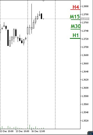 3. Индикатор отображается как набор меток (по одной для каждого ТФ) у правой границы основного окна. Цена метки соотвествует значению супертренда. Цвет метки соотвествует направлению супертренда. Рядом с меткой написан ТФ, значение которой отображает эта метка. Для зеленых меток - цена снизу, для красных - сверху.