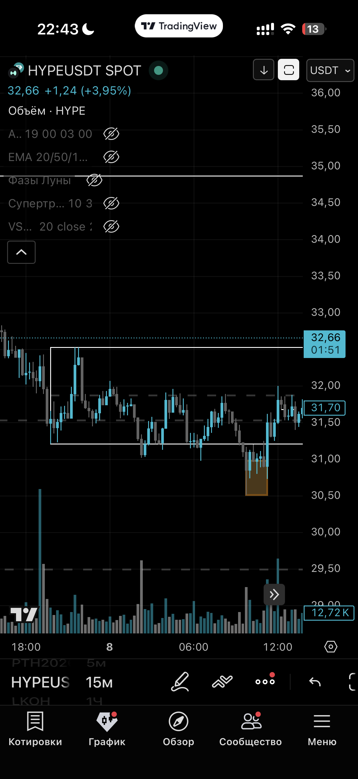 Идет тренд после которого формируется импульс и зачатие диапозона цены (боковик) . как только на 3 и так далее касании будет снятие ликвидности с одной из сторон и возврат цены в диапозон уведомлять в тг бот .