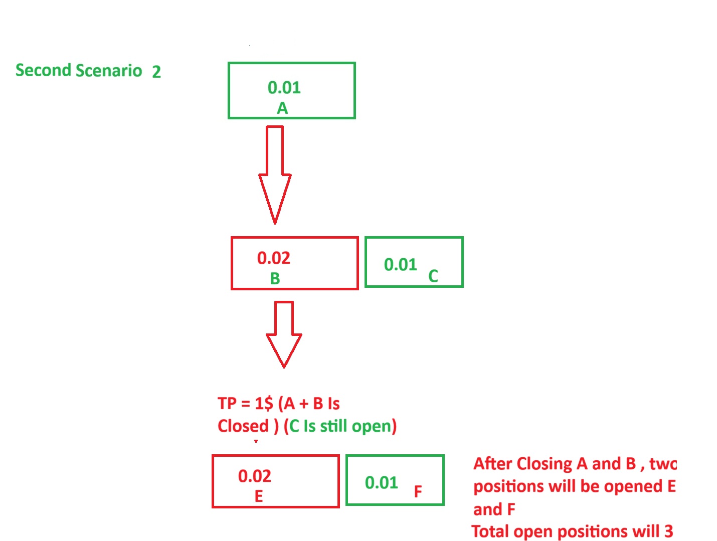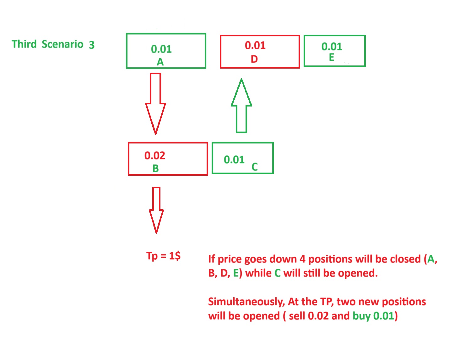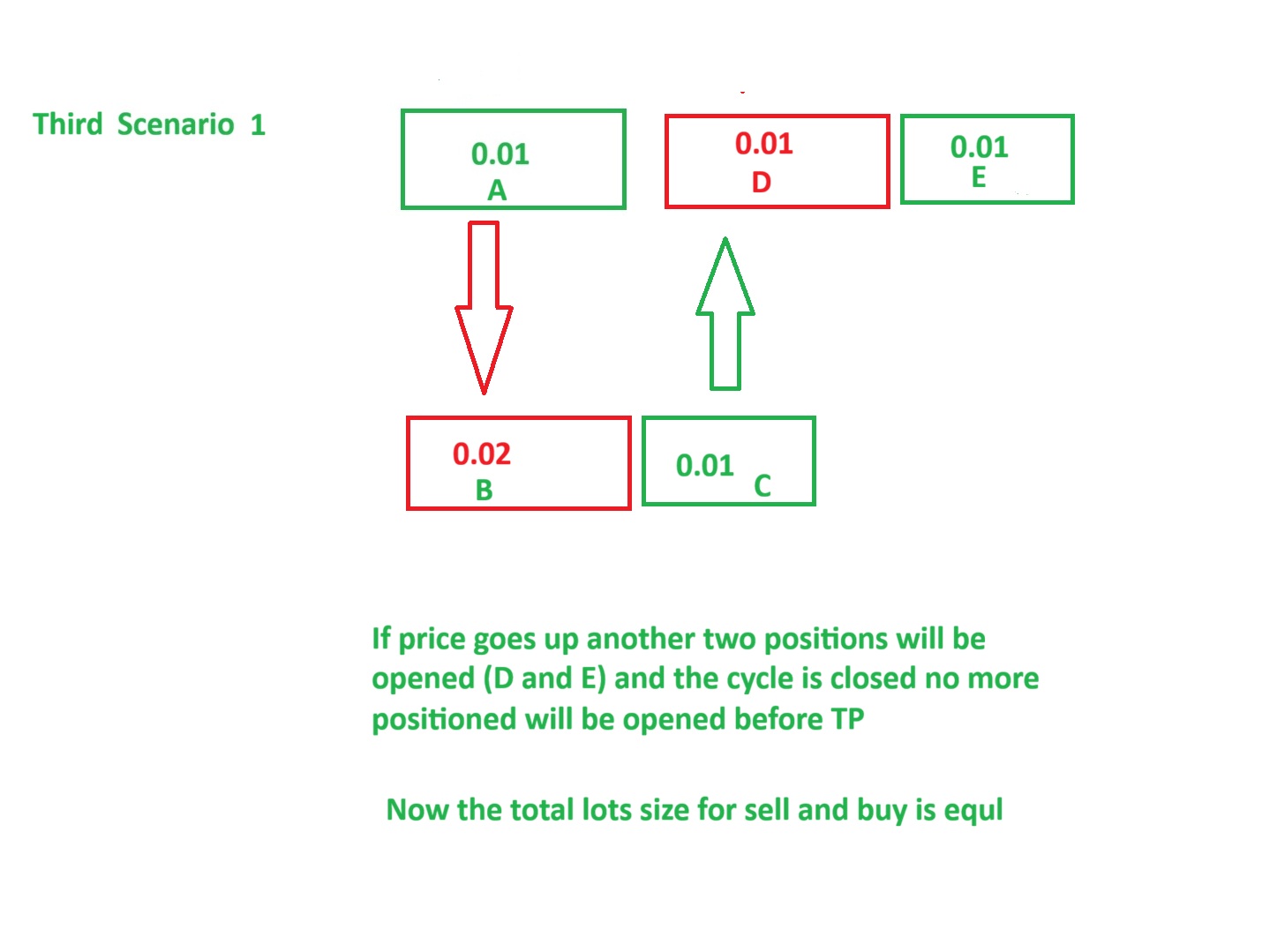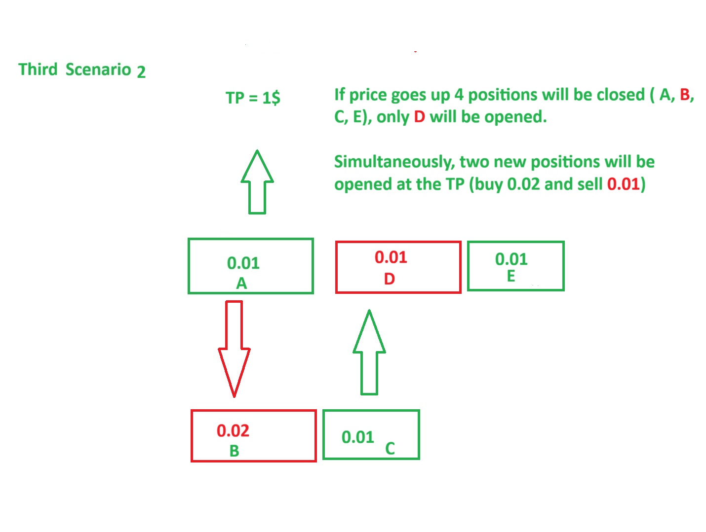 If the price reverses back up before hitting the TP in Scenario 1, open two additional positions: a Buy 0.01 (Position D) and a Sell 0.01 (Position E).