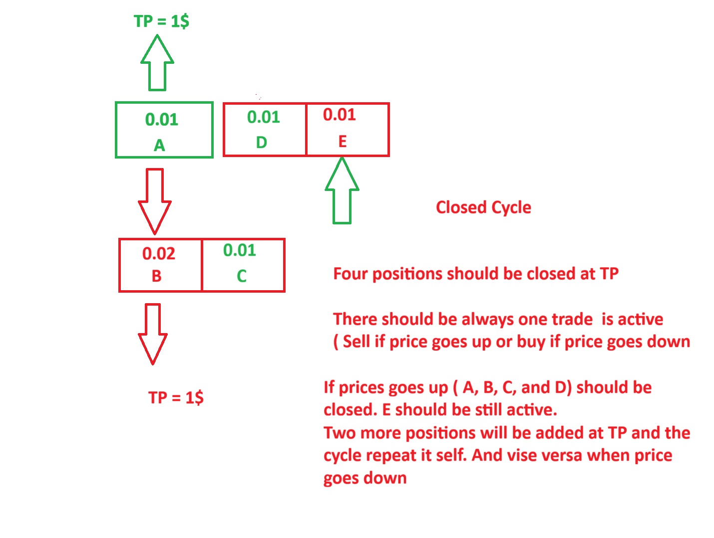 If the price goes up: Close four positions (A, B, C, and D) at the TP. Keep Position E (Sell) open. Then, open a Buy 0.02 (Position I) and a Sell 0.01 (Position J) to restart the cycle.