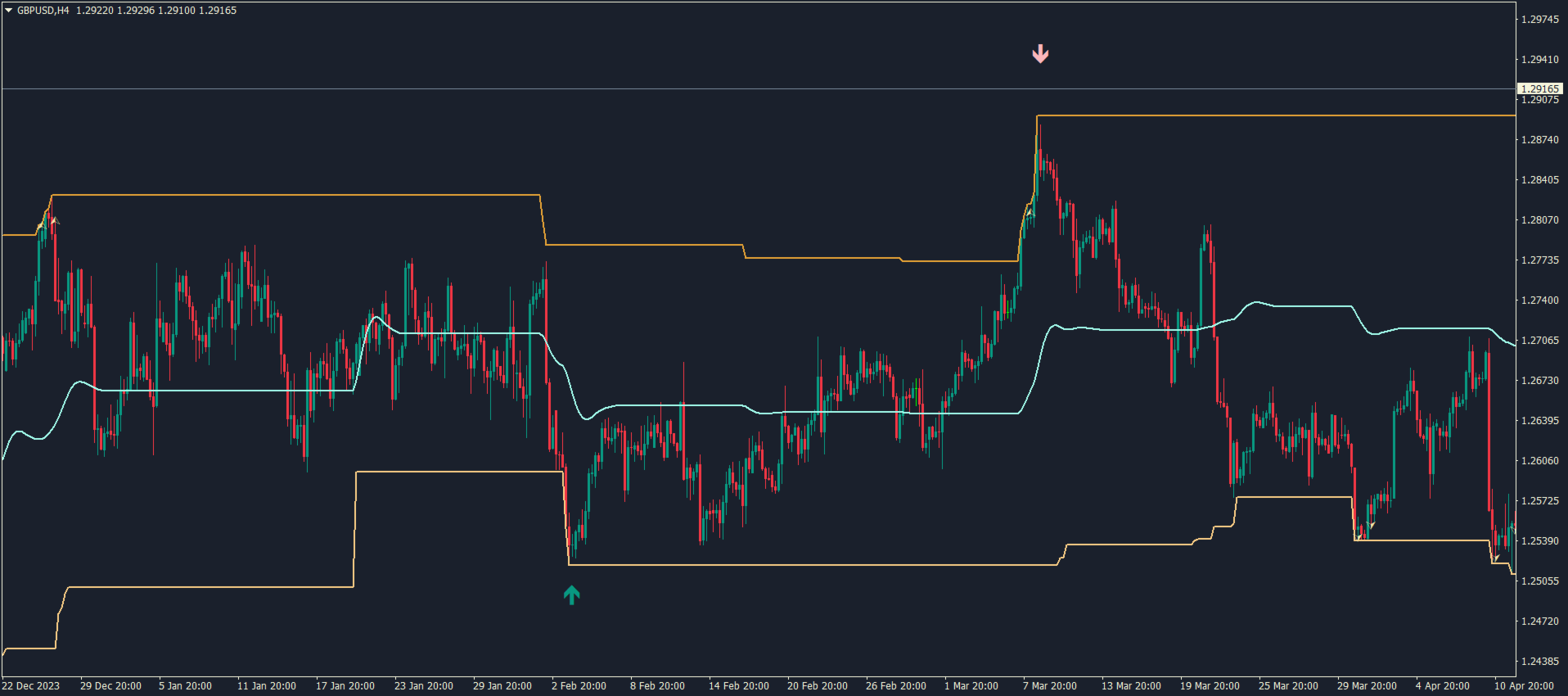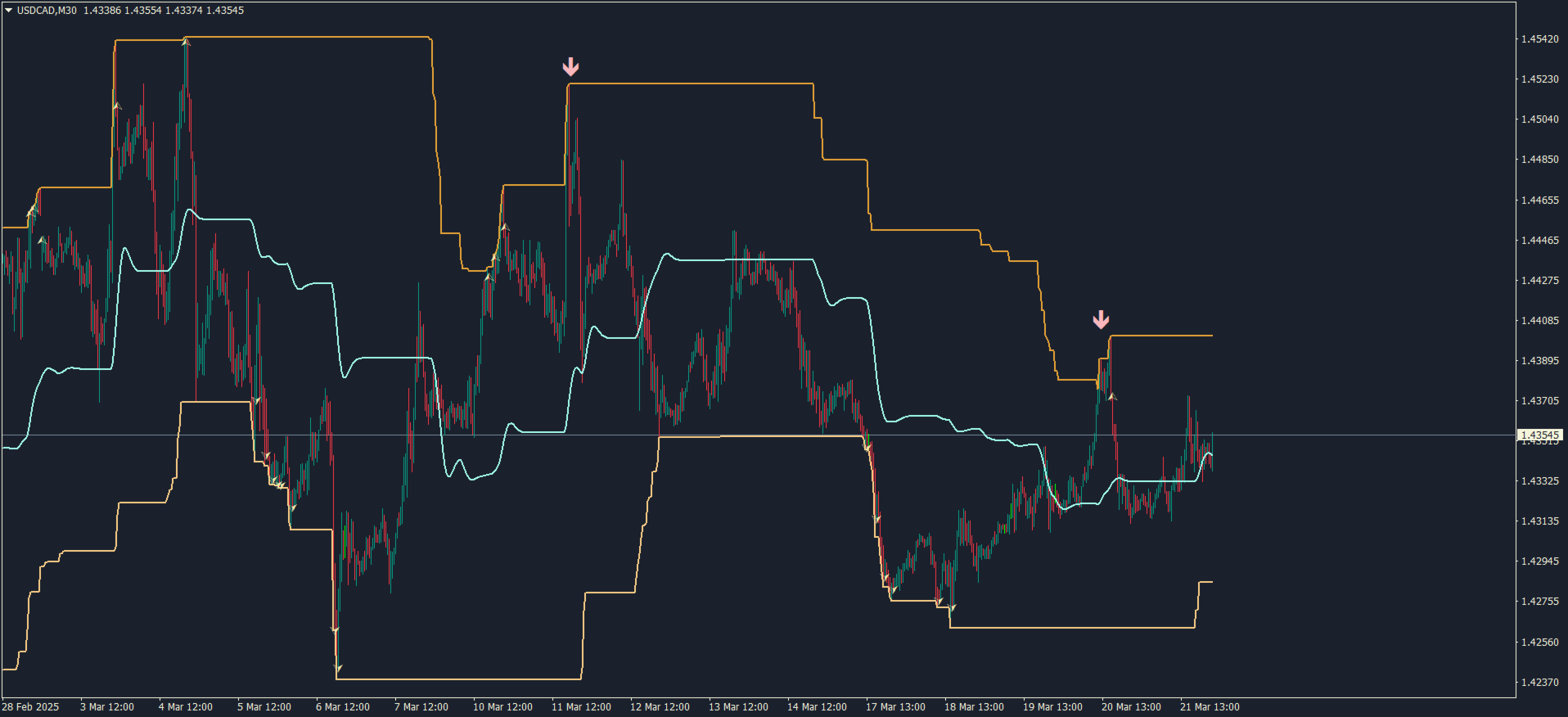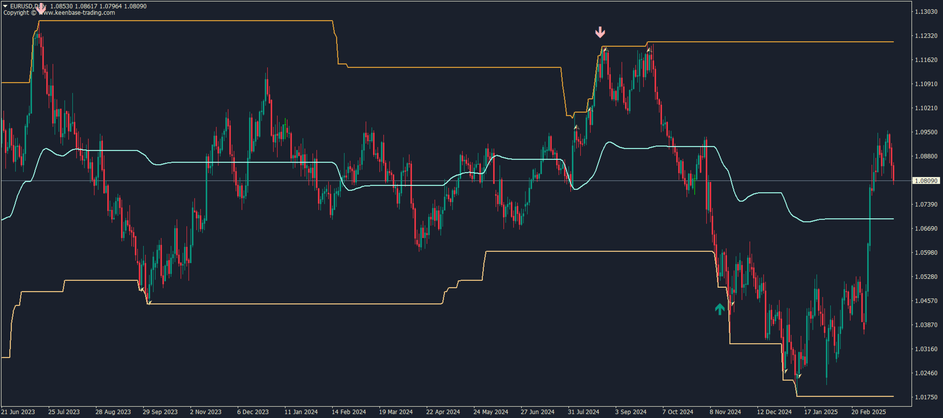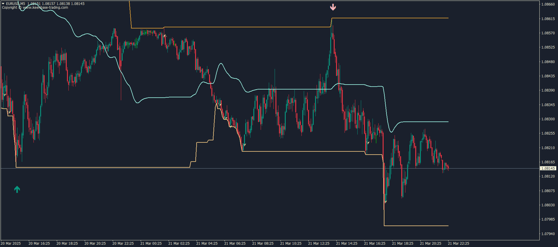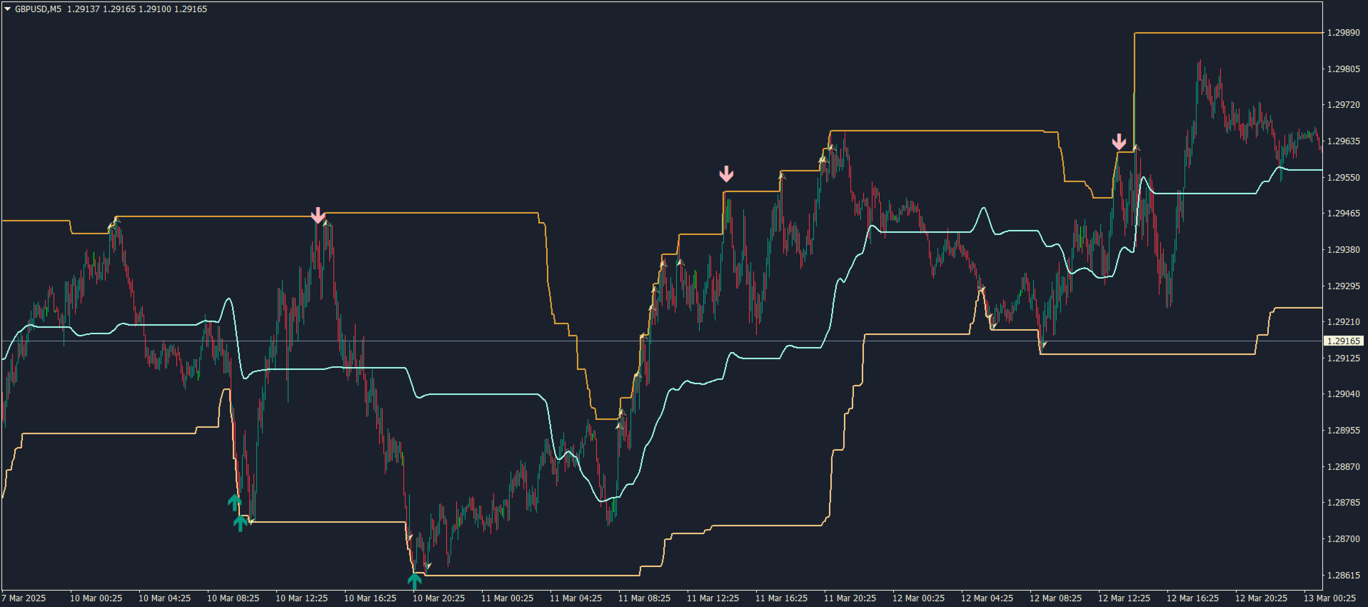 - 内置中线通道: 除了箭头,指标还显示动态价格通道和中线,帮助您理解市场当前的区间与趋势方向。