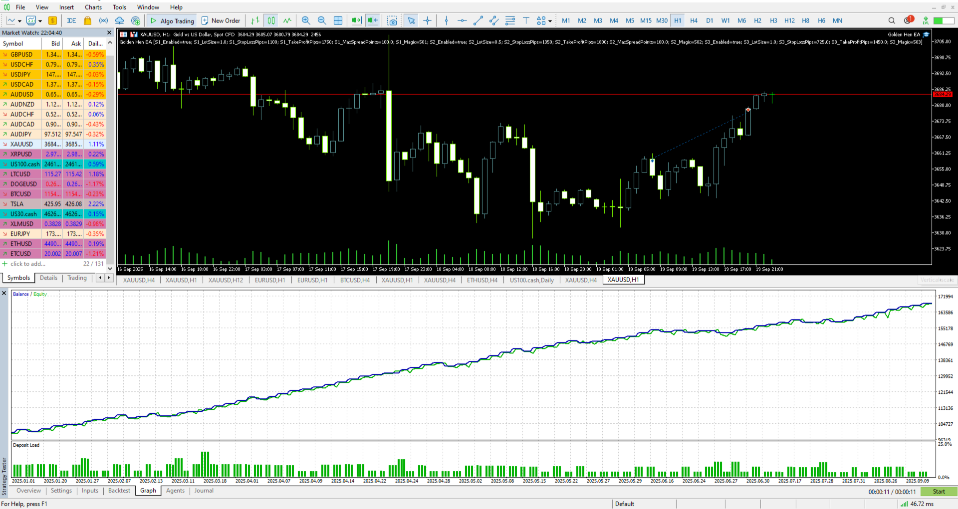 Golden Hen EA 是一款专为 XAUUSD 设计的EA(智能交易系统)。它结合了五种独立的交易策略,每种策略由不同的市场条件和时间周期(M5、M30、H2、H4、H6)触发。