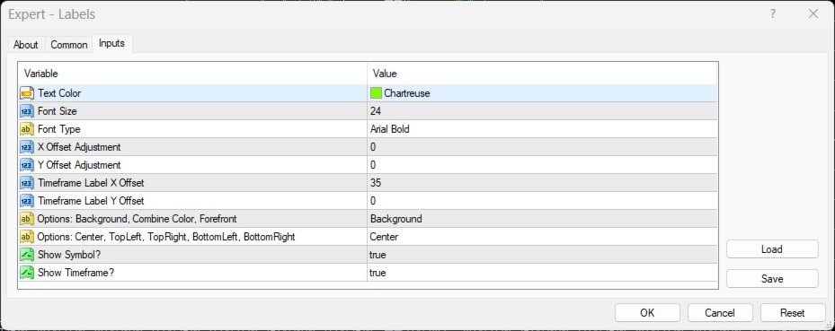 - ShowTimeframe: Enables or disables the display of the timeframe label (default: true).