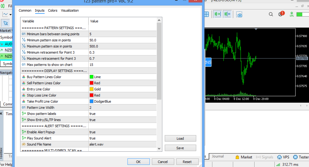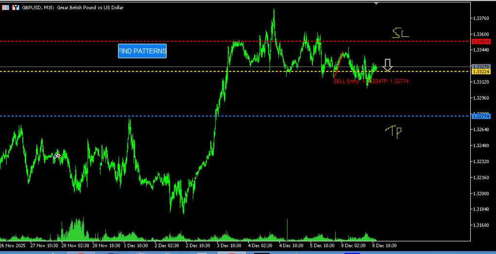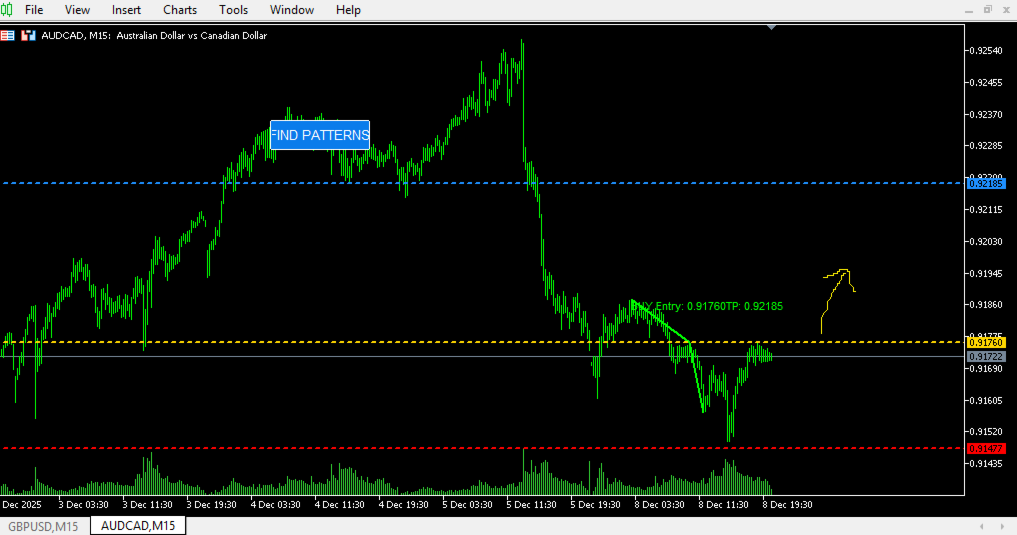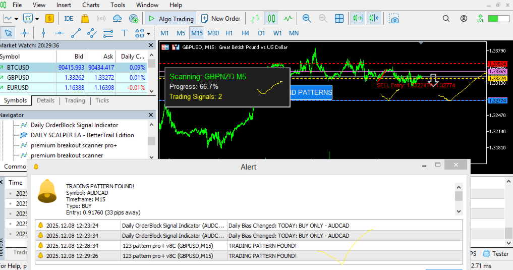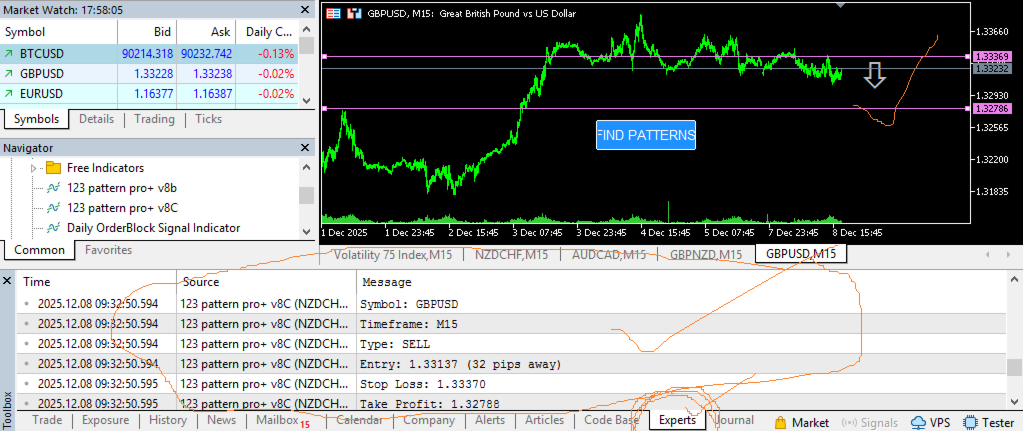 Click the "FIND PATTERNS" button or let the indicator run automatically. It scans all your preferred symbols and timeframes.