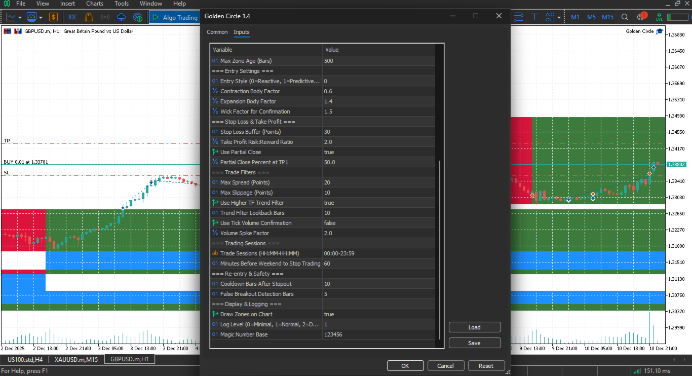 All critical parameters are exposed through the EA input interface, allowing traders to adjust risk tolerance, zone detection sensitivity, candle structure thresholds, and entry timing preferences. Configurable magic numbers enable multi-instance deployment across different symbols or strategy variations.
