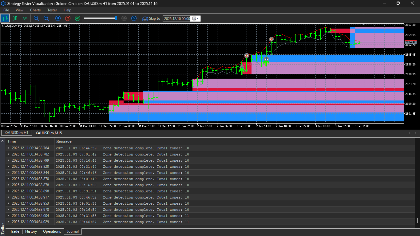 Visual chart overlays display active zones, entry markers, and stop loss/take profit levels for real-time monitoring and backtesting verification.