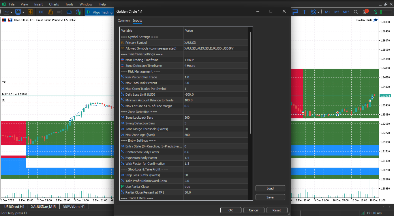 Golden Price specializes in trading XAUUSD (Gold) while maintaining full configurability for major currency pairs including AUD, EUR, and JPY crosses. The system employs a sophisticated multi-timeframe zone detection engine that identifies key supply and demand areas where institutional orders are likely concentrated.