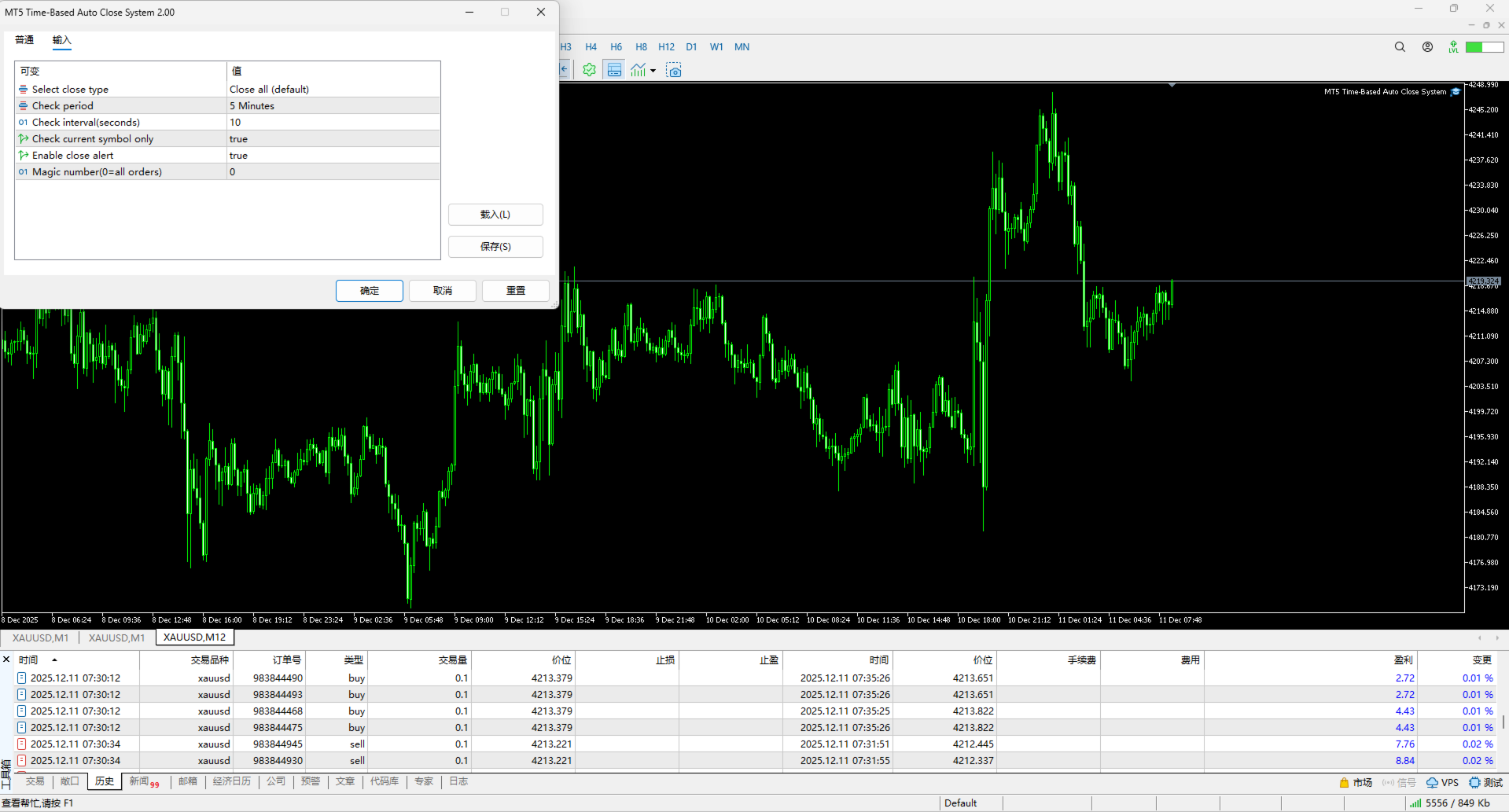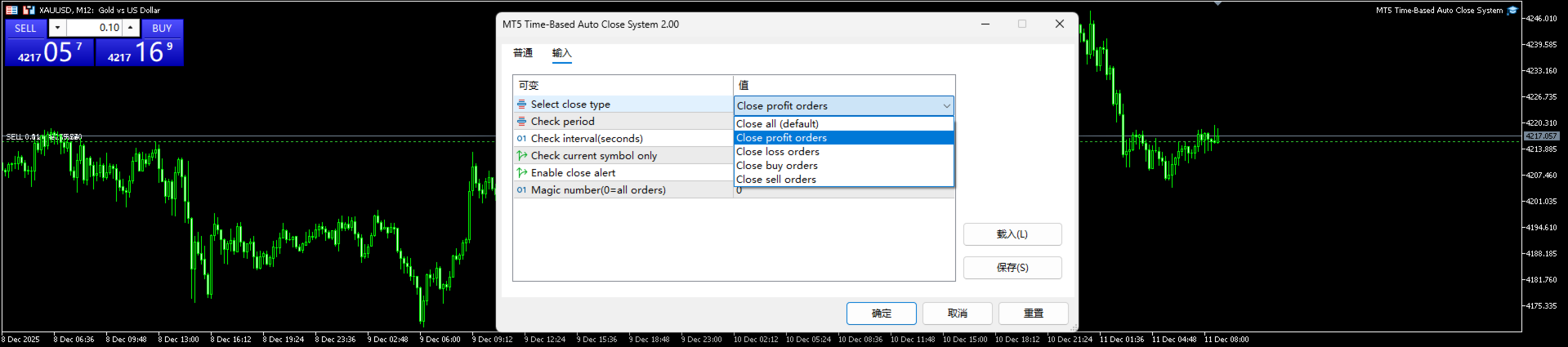 - Flexible Parameter Configuration: Users can freely set the check time cycle, the specific closing conditions (i.e., the five modes above), and achieve precise position management through magic number and trading symbol filtering functions .