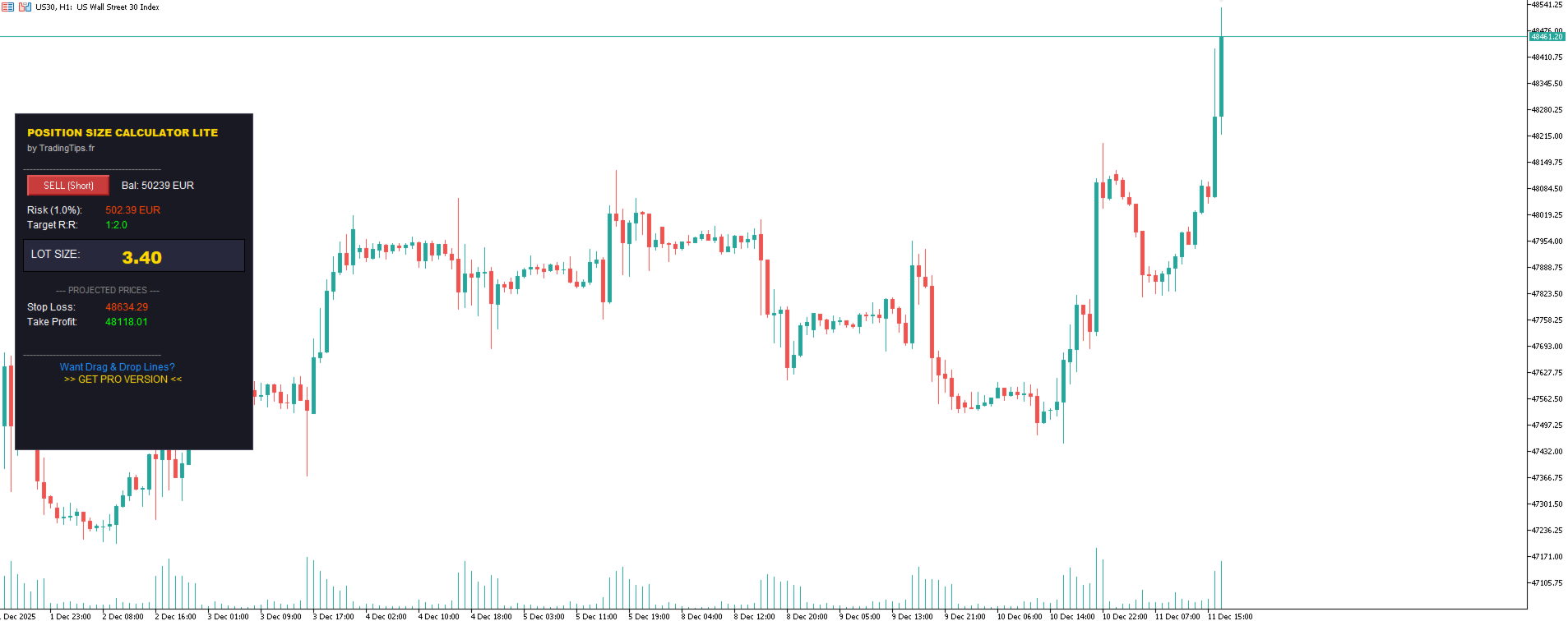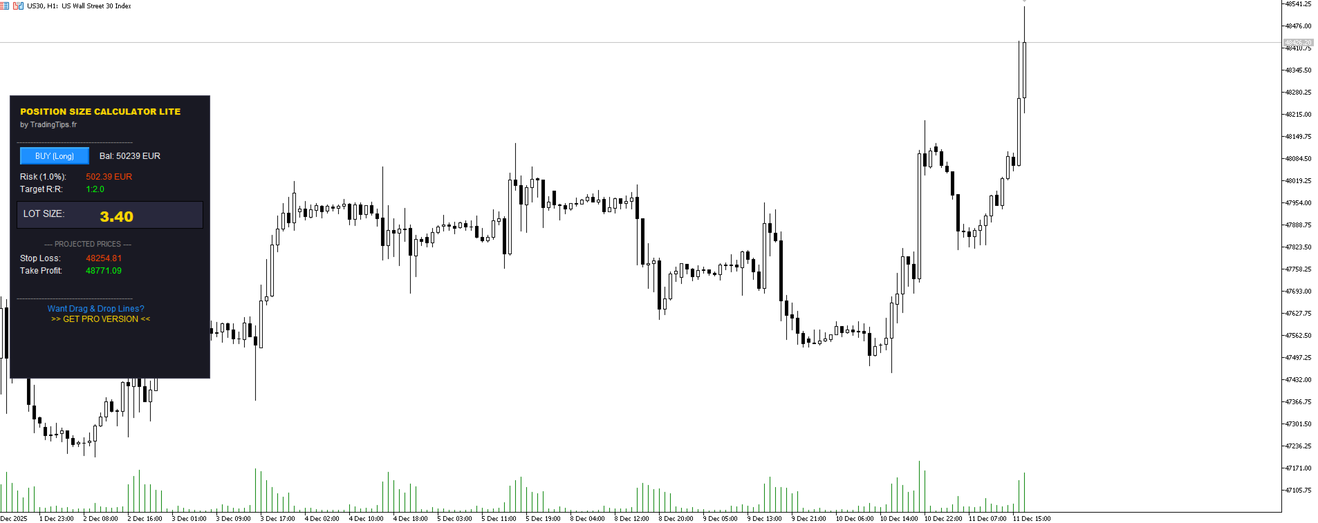 Position Size Calculator Lite MT5 是一款用于 MetaTrader 5 的免费 仓位大小计算器 和 风险管理指标。 它根据账户余额的固定风险百分比、基于 ATR 的 Stop Loss 距离以及目标 风险回报比(risk:reward) 自动计算每笔交易的最优手数(lot size)。 目标是在 MT5 中对外汇、指数、商品、CFD、加密货币等品种实施一致的资金管理。