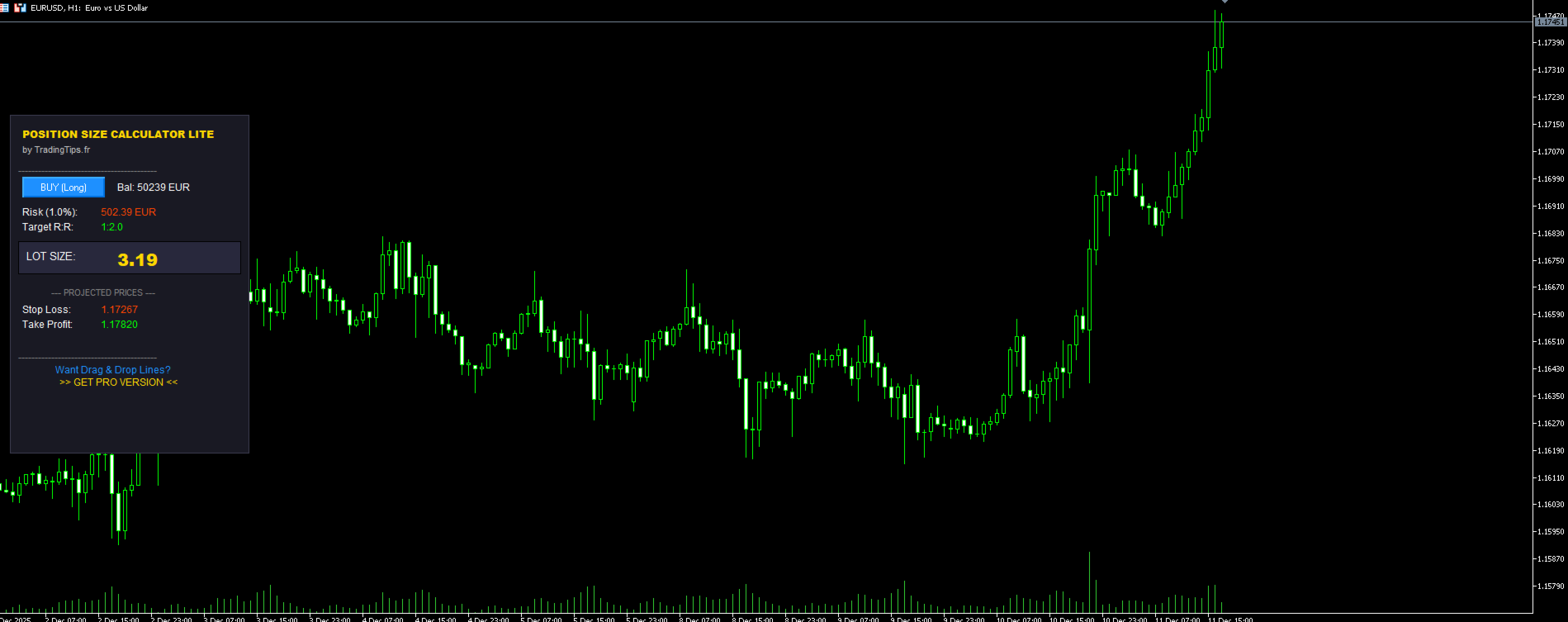 重要说明:如果您需要在图表上通过拖拽方式交互式调整 Stop Loss 和 Take Profit 区域、查看完整的风险面板、保证金信息以及更详细的风险指标,请在 Market 中搜索并使用独立产品 “Position Size Calculator PRO MT5”。本 Lite 版本是基于同一套仓位管理逻辑的精简免费版。