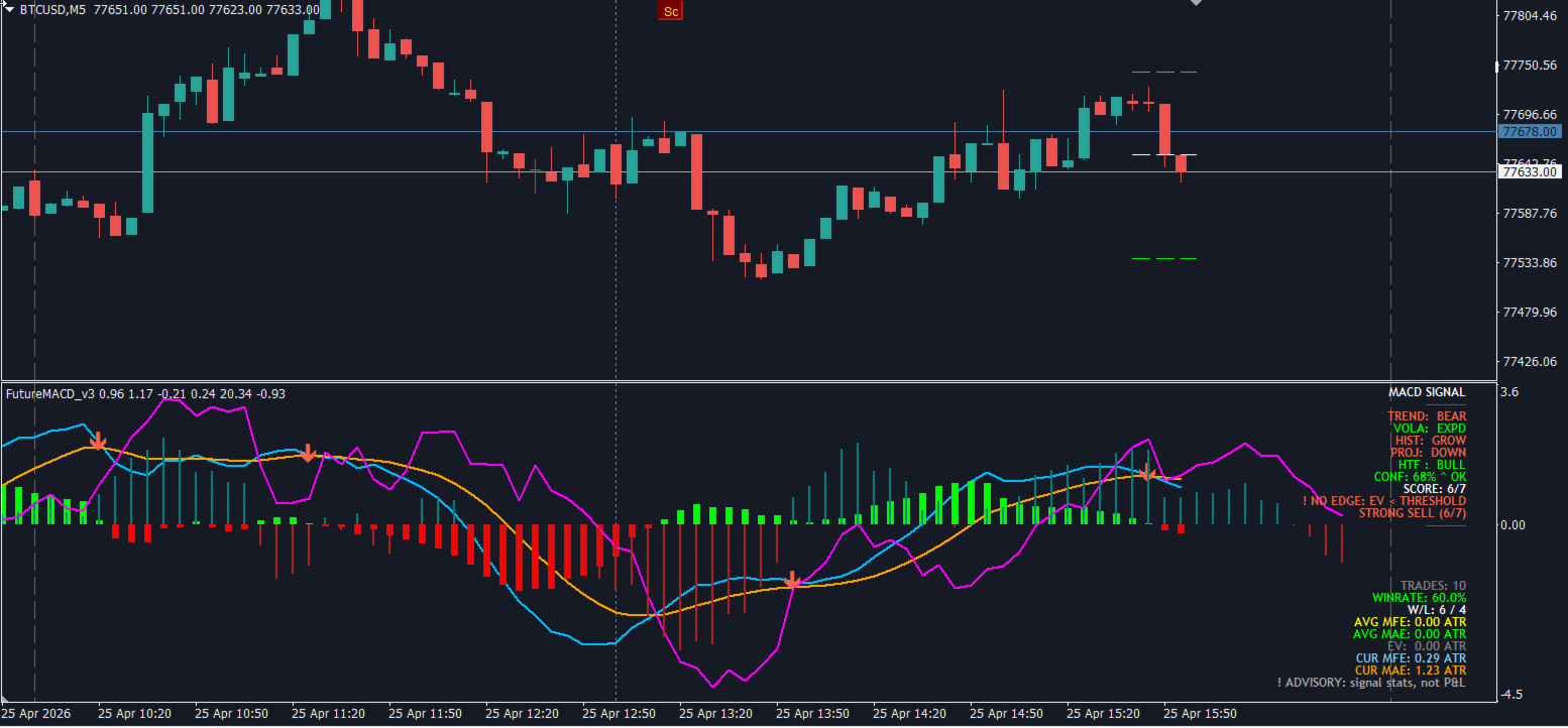 Gain a structured, statistical trading edge with MACD FuturePredict Panel Pro MT4, a non-repaint, zero-lag predictive MACD indicator for MetaTrader MT4. Designed to anticipate momentum shifts before traditional MACD crossovers occur, this tool combines early signal detection with transparent, on-chart performance metrics.