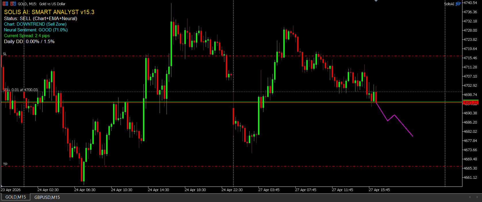 Solis AI is a professional trading algorithm specifically designed for the XAUUSD (Gold) pair on the M15 timeframe. The system integrates a proprietary neural network with advanced price action structure analysis to identify high-probability opportunities through rigorous statistical validation.