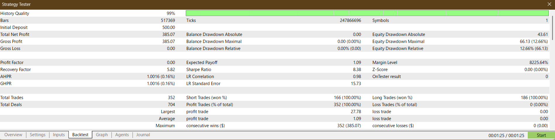 Win Rate: 100% during single-position trading (352 wins, 0 losses).