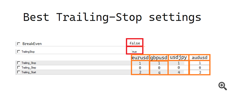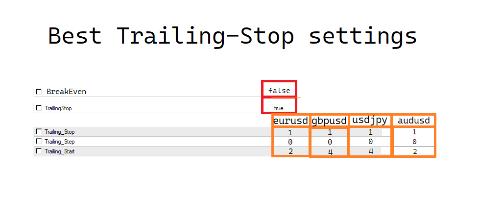 Here you have, after some tests, the best inputs for Trailing Stop and Breakeven settings: