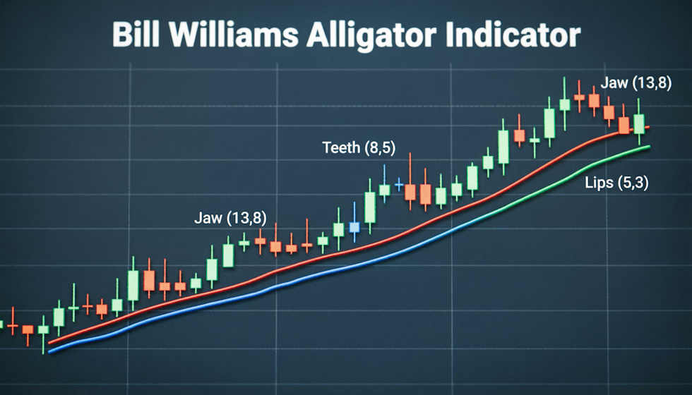 Bill Williams' "Alligator" is a technical indicator designed to identify the presence or absence of a trend in the market. It consists of three smoothed moving average lines, each with its own metaphorical name and parameters: the "Jaw" (blue line) — a 13-period SMMA shifted 8 bars into the future; the "Teeth" (red line) — an 8-period SMMA shifted 5 bars forward; and the "Lips" (green line) — a 5-period SMMA shifted 3 bars ahead. This forward displacement allows the indicator not merely to follow price action but to seemingly "anticipate" its movement. When all three lines are intertwined, it symbolizes a "sleeping alligator" — the market is ranging or consolidating without a clear direction, and trading during such periods is generally discouraged.