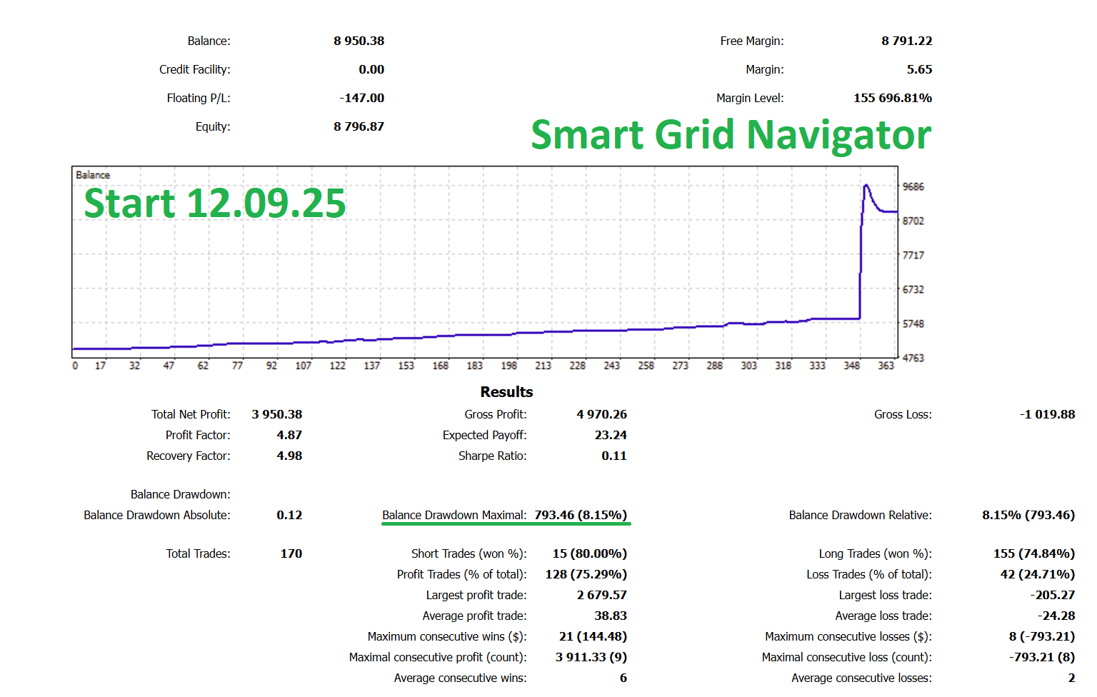 Smart Grid Navigator 是一个专业的交易智能顾问,使用多级网格策略和智能入场过滤系统。该程序根据技术指标分析和市场条件自动管理仓位。 该顾问配备优化设置,安装后即可立即使用。您可以在图表上启动它并开始测试。所有参数都具有安全的默认值,可以根据您的交易风格和风险水平进行调整。 主要功能 自动化交易 完全自动化的开仓和平仓系统 24/7全天候运行或在选定的交易时间运行 无需交易者持续监督 智能入场过滤 多级市场分析系统 通过技术指标过滤虚假信号 适应各种市场条件 灵活的风险管理 渐进式仓位大小调整,可禁用马丁格尔 篮子利润管理 可配置的止损和止盈水平 时间控制 仅在特定时间进行交易的能力 防止在不利时段交易 交易系列之间的暂停以降低风险 影响结果的关键参数 盈利能力和回撤参数 StartLot(起始手数)- 第一个仓位的基础交易量 增加数值:每笔交易利润更高,但风险和回撤更大 减少数值:风险和回撤更低,但每笔交易利润更少 LotMultiplier(手数乘数)- 网格中交易量增加的系数 数值 1.0:马丁格尔已禁用,所有订单以相同手数开仓(最低风险) 数值