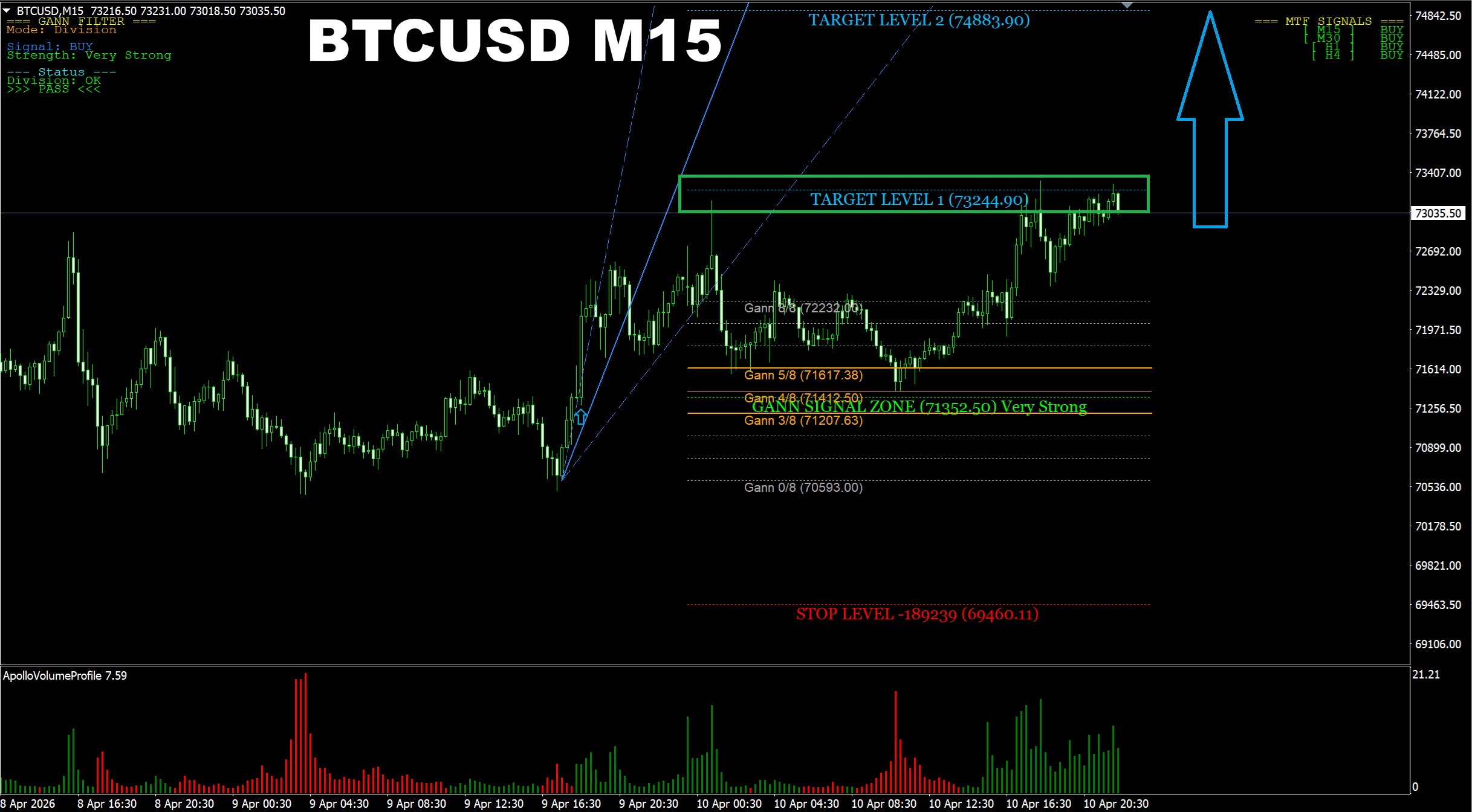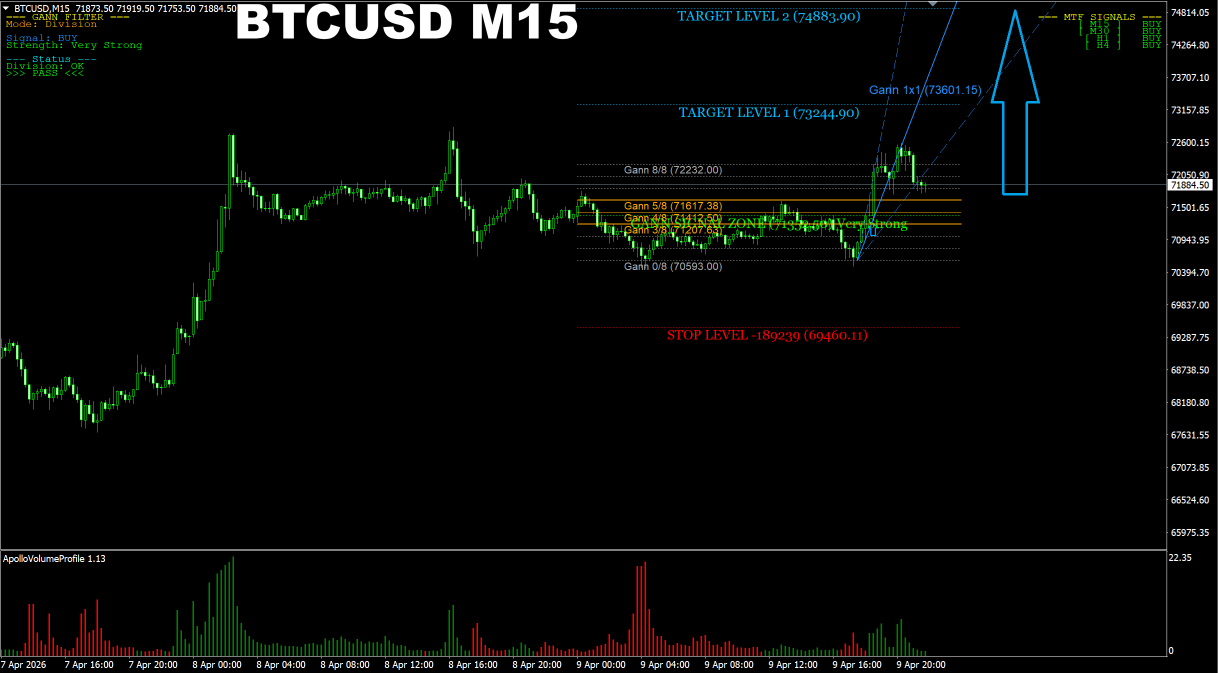 Gann Made Easy. BTCUSD M15. Update on the BUY signal I provided yesterday. Price has reached the main target. 2nd target is still active. Waiting for the 2nd target to be reached.