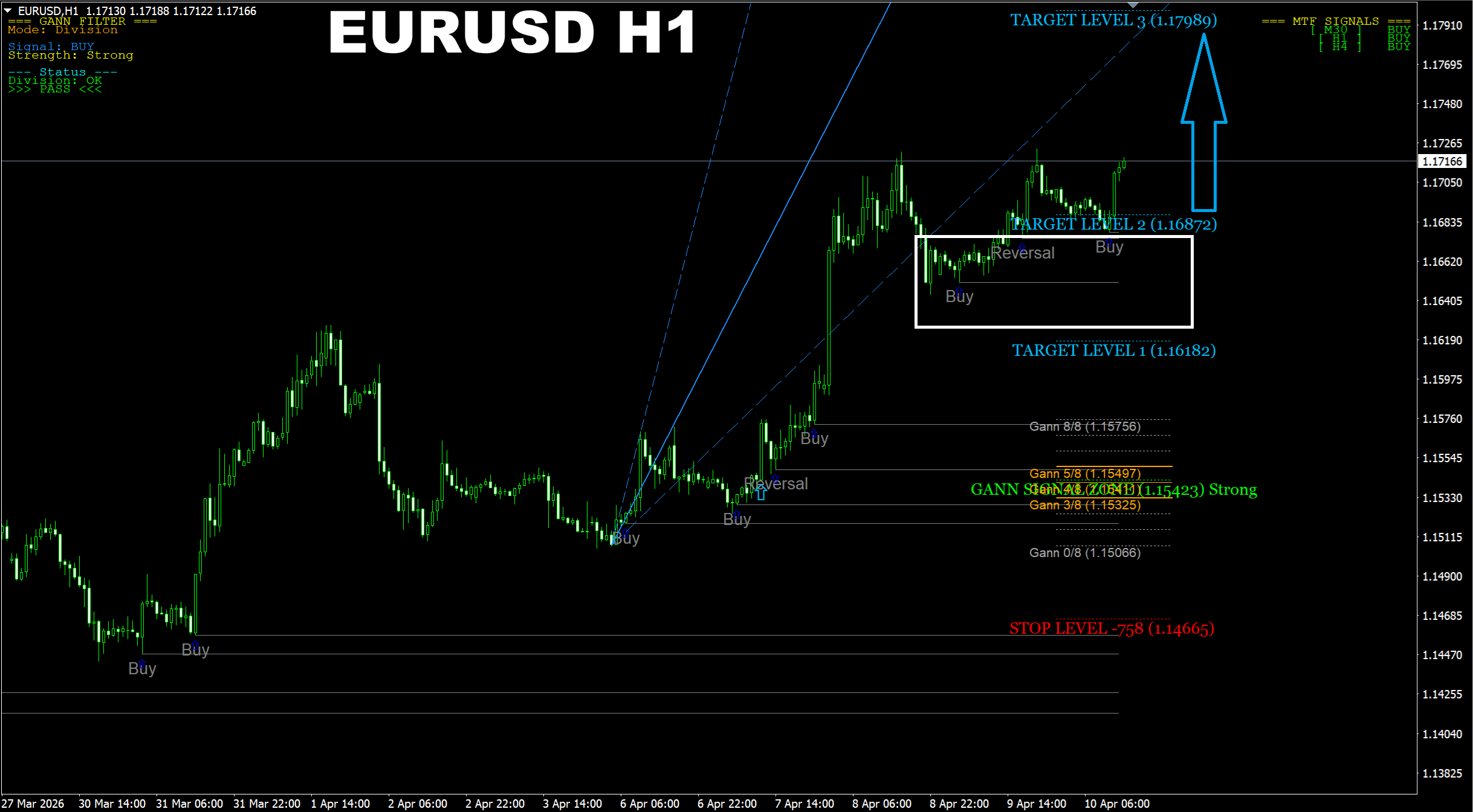 Gann Made Easy system. EURUSD H1. Update on current market. We have BUY + Reversal pattern formed already. And as you know from my trading instructions, this is a sign of an UP trend continuation. And thus we can expect price to start moving higher. First we should work with the M15 TF's target I provided yesterday which is the 1.17466. And only when this area is reached, we can consider the 1.17989 from H1 as our next target which is final in terms of the H1 wave.