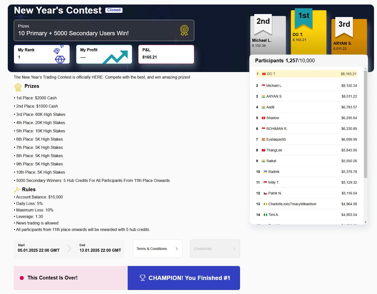Using a 100% technical analysis methodology, I won the New Year's Contest 2025, taking first place and the $2,000 prize. The contest was highly competitive and challenging