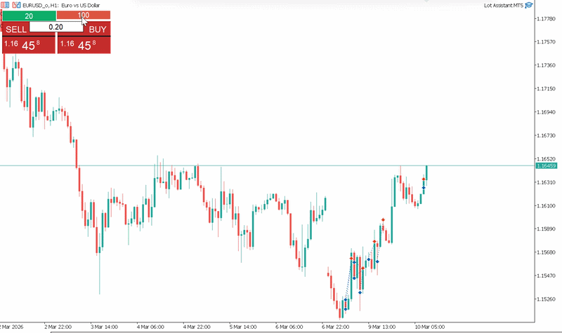 Lot Assistant MT5 介绍 基于 风险金额(美元) 和 止损 的智能手数计算 快速 一键交易 并自动设置止损 简洁直观的交易面板,灵感来自 MetaTrader One Click Trading Lot Assistant MT5 是一款免费的交易工具,旨在帮助交易者管理风险并快速开仓。该面板的设计灵感来自许多交易者已经熟悉并用于快速执行交易的 MetaTrader One Click Trading 工具。除了快速的 Buy 和 Sell 按钮之外,该工具还提供两个重要的可编辑字段:Profit 和 Stop Loss。只需设置止损点数以及您愿意承担的风险金额,工具就会自动计算正确的交易手数。当交易被打开时,系统会使用计算出的手数立即执行交易,并自动设置止损,从而帮助交易者以更安全、更可控的方式进行交易。 如何使用 使用 Lot Assistant MT5 非常简单。面板显示三个主要的可编辑字段:Profit、Stop Loss 和 Lot Size。Profit 框(绿色)和 Stop Loss