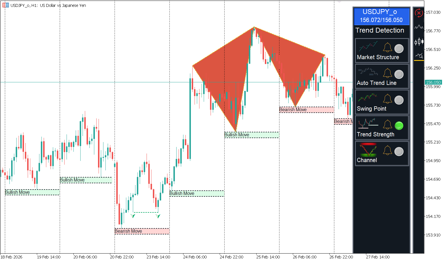 Strategy Assistant 介绍 15种强大的交易策略集成在一个智能指标中 简单设置,无需复杂参数 特别发布价格 $99(前100名买家),最终价格 $149 MT4 Version : Open Strategy Assistant 是一款强大的 一体化 交易工具,旨在帮助交易者使用专业交易者常用的一些最流行且最有效的策略来分析市场。 无需安装多个指标或在不同工具之间切换, Strategy Assistant 将 15种强大的策略 集成在一个智能助手中。这些策略被分类组织在右侧菜单的精美图形仪表板中。 分类与策略详情: 价格形态 这些经典图表形态帮助交易者识别潜在的反转和趋势延续。 • 双顶 / 双底 • 头肩形态 • 蝴蝶形态 • 三角形形态 • 供需区域 K线形态 识别高概率K线信号,帮助交易者判断市场情绪和潜在反转。 • 吞没形态 • Inside Bar • 十字星 • 晨星 / 暮星 • 锤子线 趋势工具 通过智能自动工具理解市场结构并评估趋势强度。 • 市场结构 • 自动趋势线 • 波段点 • 趋势强度 • 通道检测