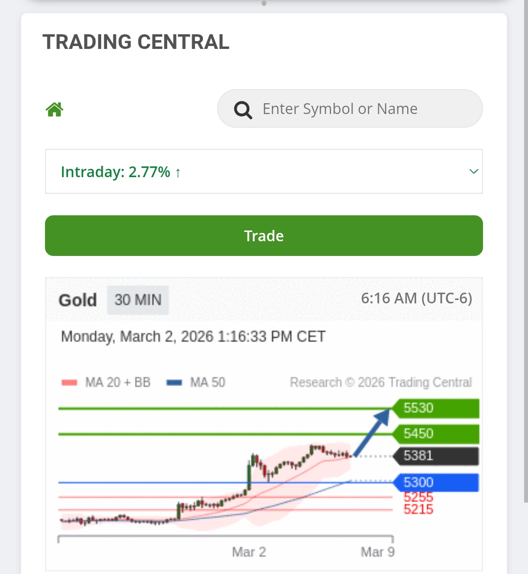 Oks when you click on Trading Central another tab opens that says Trading Central wep app. Click on it and a window opens you will see several assets. To find the Gold, click on the magnifying glass, type gold and you get the description and the image. It enters in London and New York time because it is more liquid. Then place Buy Limit or Sell Limit Orders depending on the signal from the support or resistance and pivot point 10 pips away until you reach the price and place TP at 5 pips or 10 pips