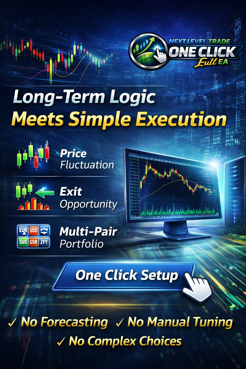 Next Level Trade One Click is a system that allows users to set up quickly without the burden of complex configurations—simply by selecting a risk level—while operating across multiple pairs with controlled lot increases and dynamic distance layers. The focus of the strategy is not to predict the market, but to benefit from the inherent fluctuations of the market through risk diversification, aiming for stable long-term growth.