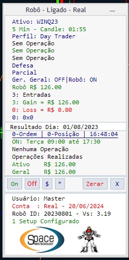 Space Daileon pode ser usando em qualquer corretora podendo configurar até 3 setups no mesmo Robô. Controle de gestão de risco, intervalo de horários, ganho por percentual, rolagem automática de contrato, histórico de todas as operações, envio de notificação das ações do robô. Para conhecer mais sobre o projeto acesse www.spaceinfo.com.br e faça o seu cadastro.