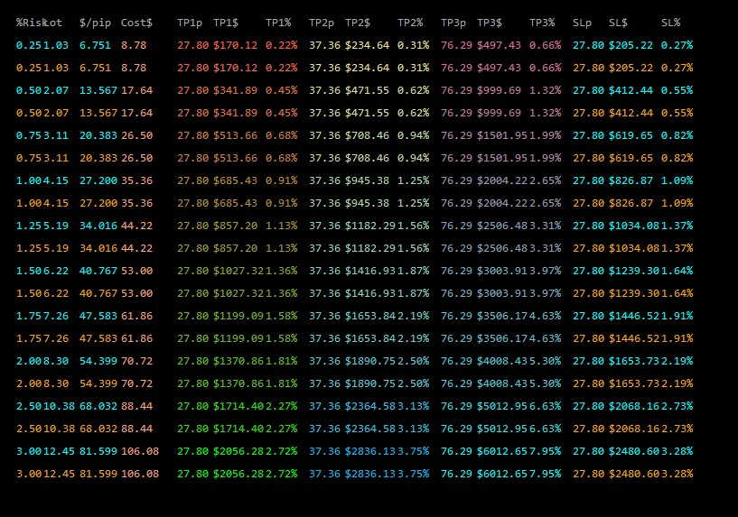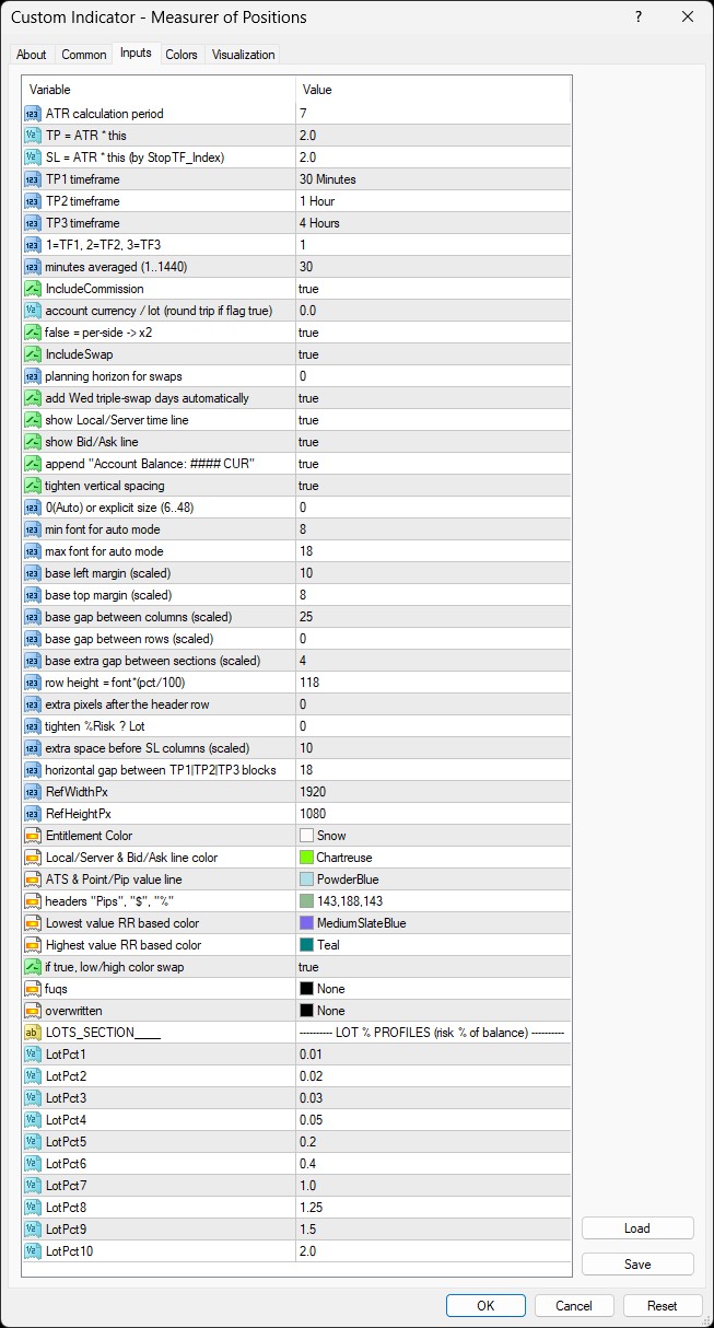 An on‑chart, data‑driven pre‑trade planner that turns your broker’s live market properties into clear, actionable numbers. It consolidates spread, commission, swaps, ATR‑based stop/targets, pip/point value and 10 risk‑profile lot sizes into one compact panel that auto‑scales to any chart size. The display is direction‑agnostic (no LONG/SHORT duplication) and emphasizes total trade cost and true risk/reward before you click “Buy/Sell.” What it shows (at a glance) Time & price context