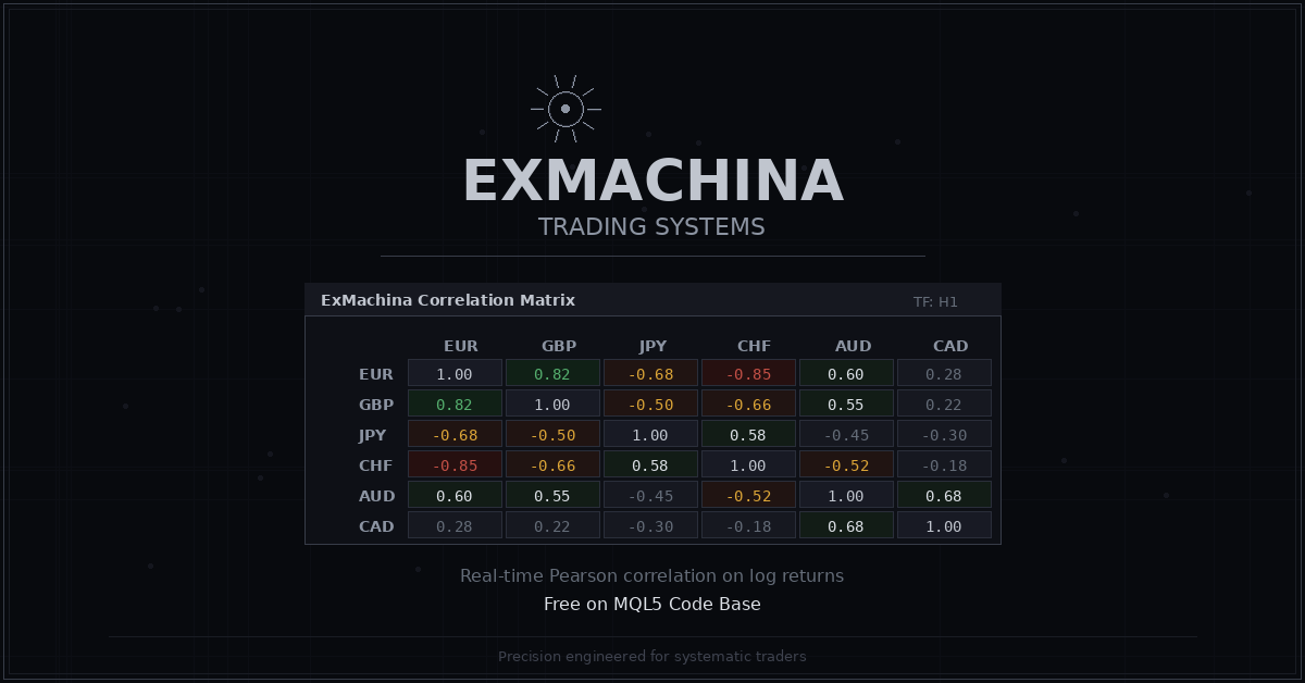 I just published my first free indicator on the Code Base: ExMachina Correlation Matrix. It computes real-time Pearson correlation on log returns for up to 6 pairs, with a built-in hedge opportunity scanner.